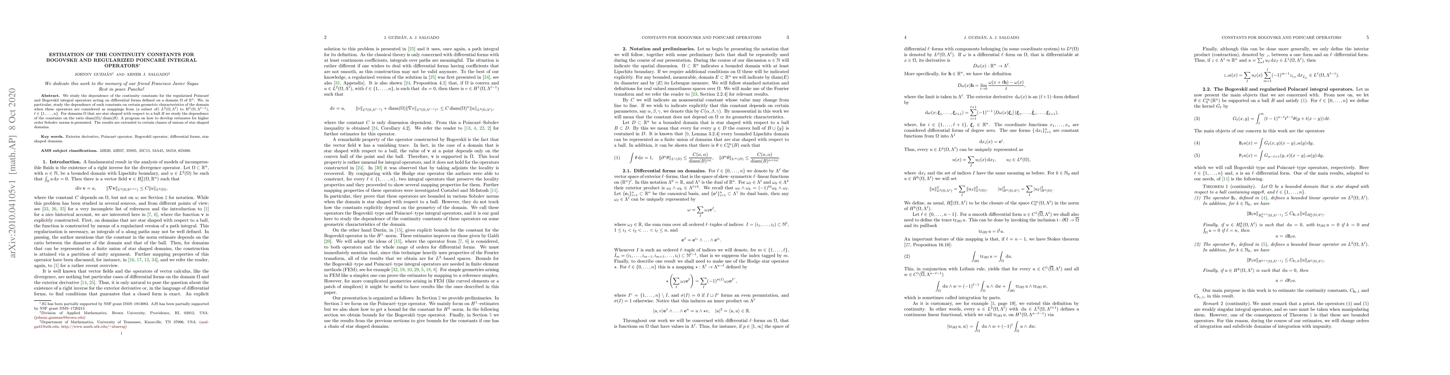 We study the dependence of the continuity constants for the regularized Poincar\'e and Bogovski\u{\i} integral operators acting on differential forms defined on a domain $\Omega$ of $\mathbb{R}^n$. We, in particular, study the dependence of such constants on certain geometric characteristics of the domain when these operators are considered as mappings from (a subset of) $L^2(\Omega,\Lambda^\ell)$ to $H^1(\Omega,\Lambda^{\ell-1})$, $\ell \in \{1, \ldots, n\}$. For domains $\Omega$ that are star shaped with respect to a ball $B$ we study the dependence of the constants on the ratio $diam(\Omega)/diam(B)$. A program on how to develop estimates for higher order Sobolev norms is presented. The results are extended to certain classes of unions of star shaped domains.