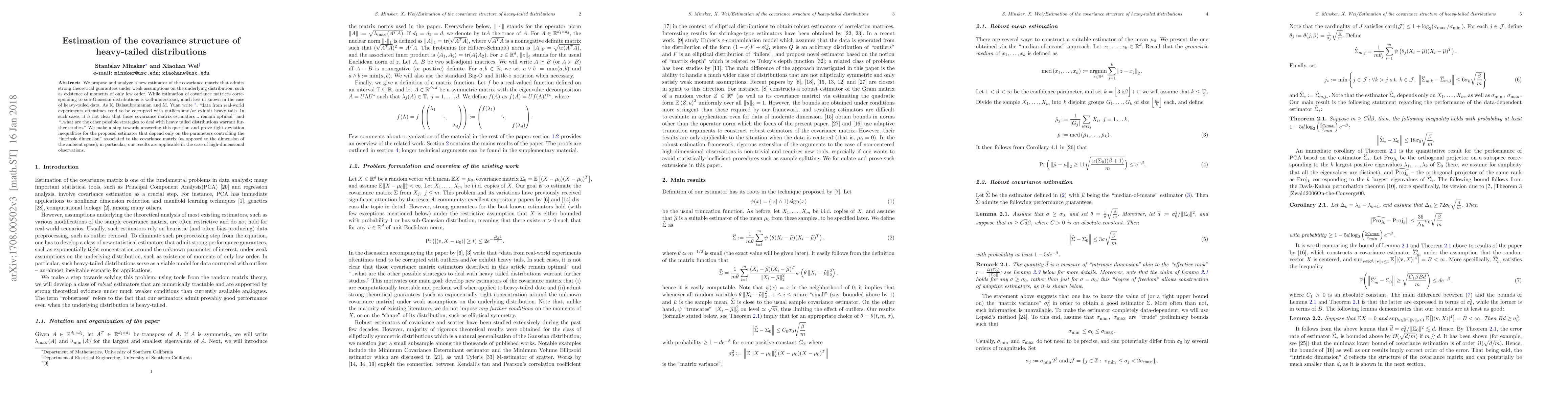 This paper proposes a new estimator for the covariance matrix under heavy-tailed distributions, providing strong theoretical guarantees with minimal assumptions. The authors prove tight deviation inequalities for the estimator, focusing on the intrinsic dimension rather than the ambient space dimension, thus addressing the challenges of high-dimensional data with heavy tails.