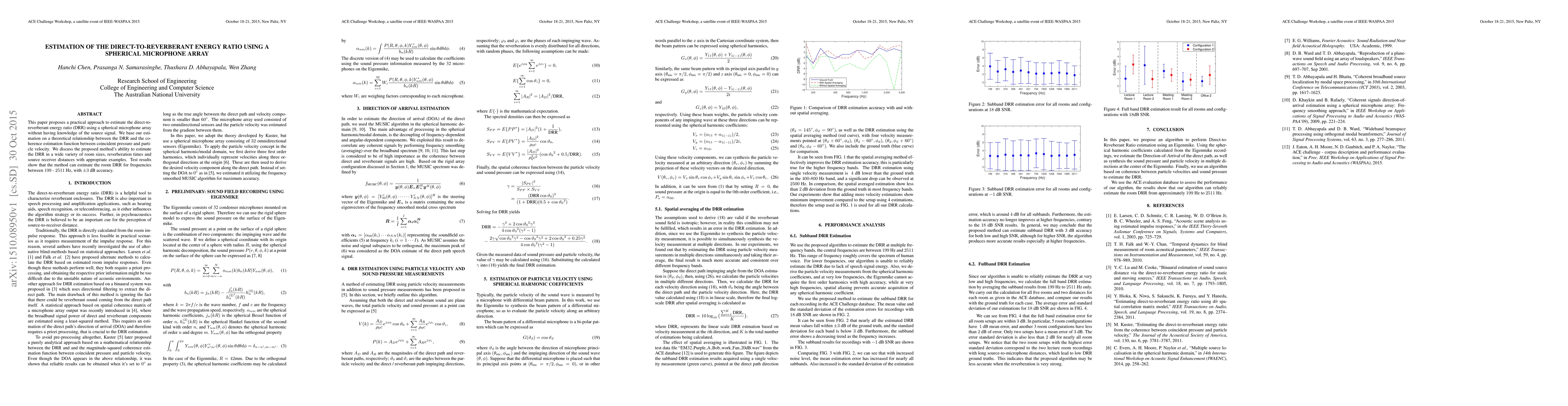 This paper proposes a method for estimating the direct-to-reverberant energy ratio (DRR) using a spherical microphone array, relying on coherence estimation without source signal knowledge. The method demonstrates accuracy across various room conditions and frequencies, achieving ±3 dB precision for DRR estimation between 199-2511 Hz.
