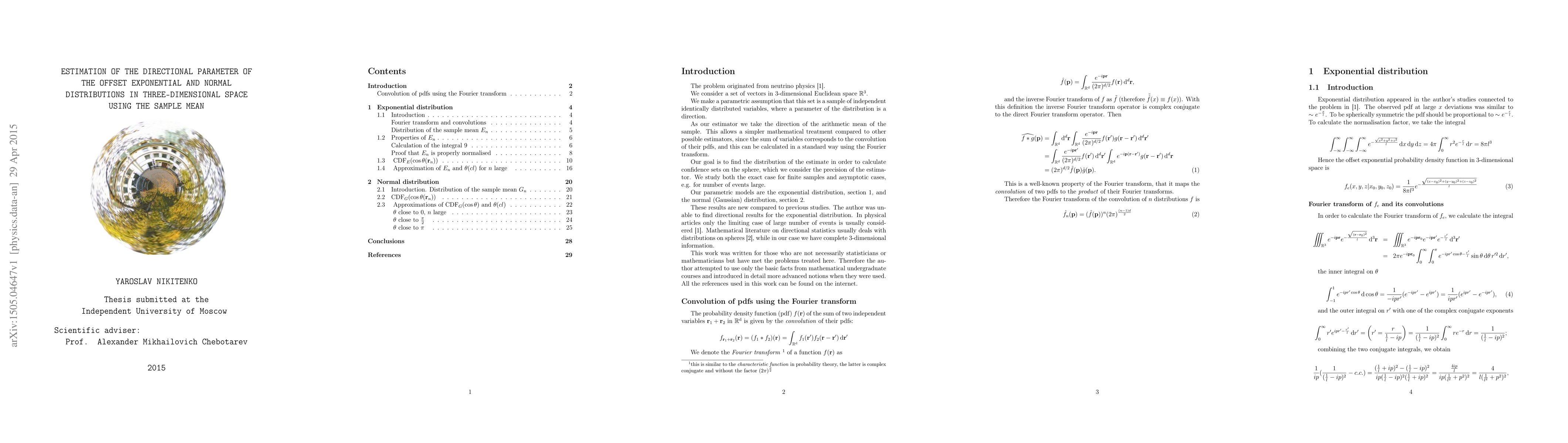 This paper analytically estimates the directional precision of the sample mean for offset exponential and normal distributions in three-dimensional space, revealing connections with modified Bessel and hypergeometric functions, and provides approximation formulae for the distribution of the sample mean and its directional precision.