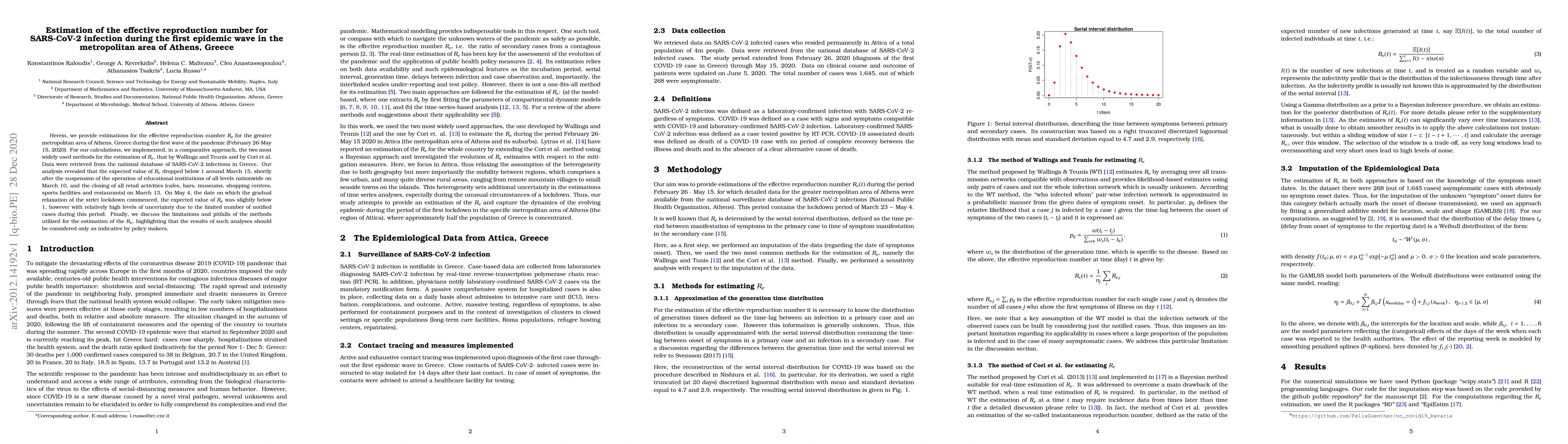 This paper estimates the effective reproduction number $R_e$ for SARS-CoV-2 in Athens, Greece during the first pandemic wave, finding it dropped below 1 around March 15 due to lockdown measures, and remained slightly below 1 by May 4 with high uncertainty. The study uses two widely-accepted methods for $R_e$ estimation.