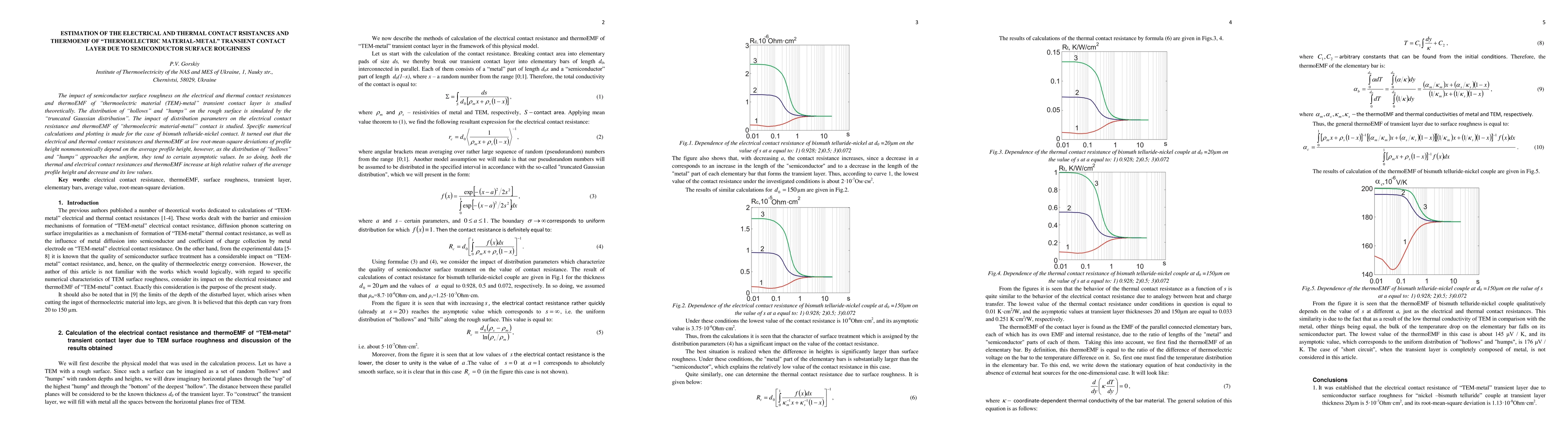 This paper theoretically investigates how semiconductor surface roughness affects the electrical and thermal contact resistances and thermoEMF in thermoelectric material-metal transient contact layers, using a truncated Gaussian distribution to simulate surface features. The study examines the influence of distribution parameters on these contact properties.