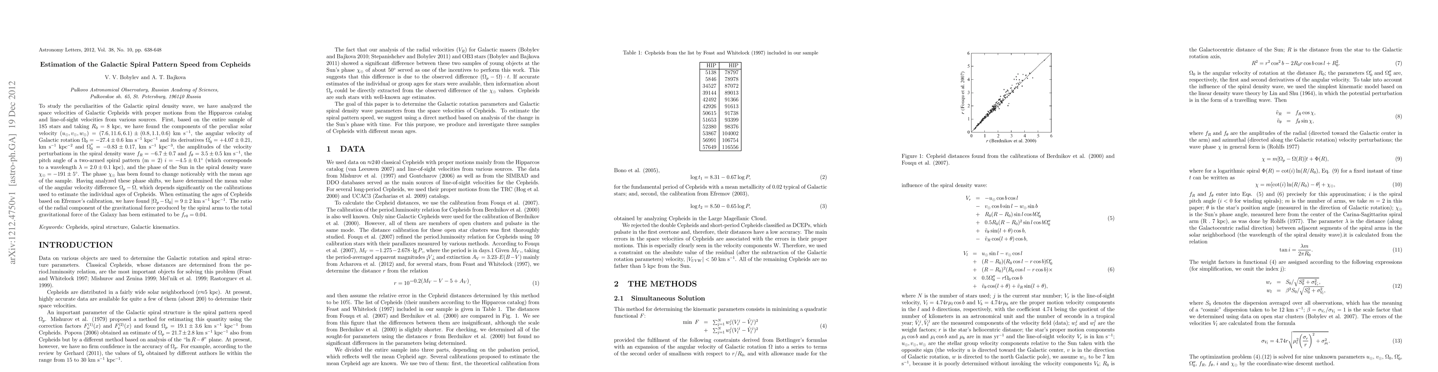 This paper estimates the Galactic spiral pattern speed using Cepheids' space velocities, finding $\Omega_p-\Omega_0=9\pm2$ km s$^{-1}$ kpc$^{-1}$ and a pitch angle of $-4.5\pm0.1^\circ$. The study also reveals a noticeable phase shift in the Sun's position in the spiral pattern with Cepheids' mean age.