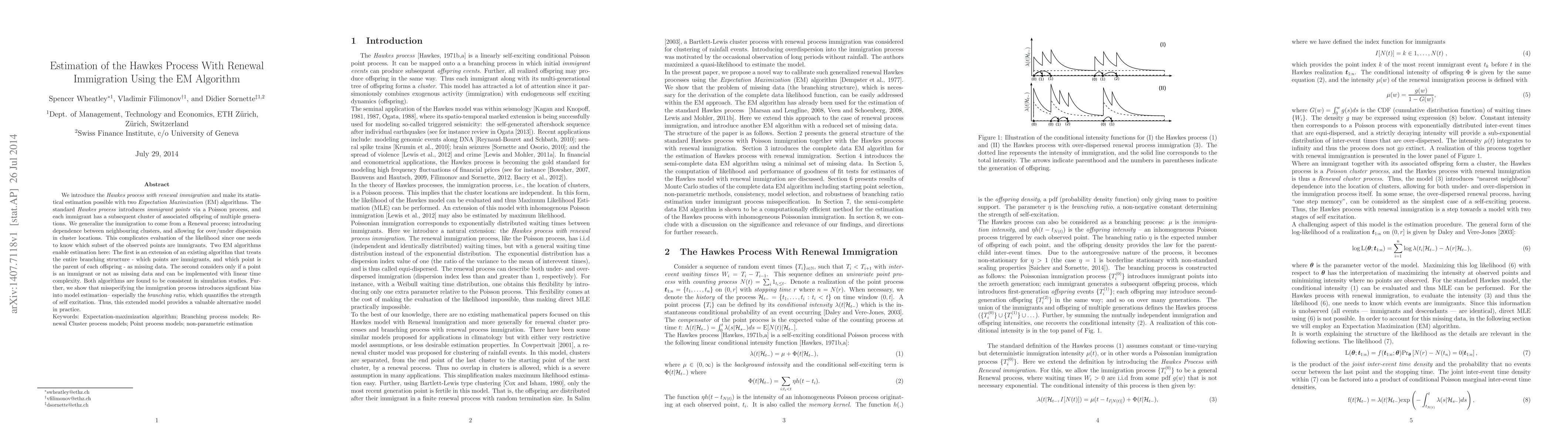 We introduce the Hawkes process with renewal immigration and make its statistical estimation possible with two Expectation Maximization (EM) algorithms. The standard Hawkes process introduces immigrant points via a Poisson process, and each immigrant has a subsequent cluster of associated offspring of multiple generations. We generalize the immigration to come from a Renewal process; introducing dependence between neighbouring clusters, and allowing for over/under dispersion in cluster locations. This complicates evaluation of the likelihood since one needs to know which subset of the observed points are immigrants. Two EM algorithms enable estimation here: The first is an extension of an existing algorithm that treats the entire branching structure - which points are immigrants, and which point is the parent of each offspring - as missing data. The second considers only if a point is an immigrant or not as missing data and can be implemented with linear time complexity. Both algorithms are found to be consistent in simulation studies. Further, we show that misspecifying the immigration process introduces signficant bias into model estimation-- especially the branching ratio, which quantifies the strength of self excitation. Thus, this extended model provides a valuable alternative model in practice.