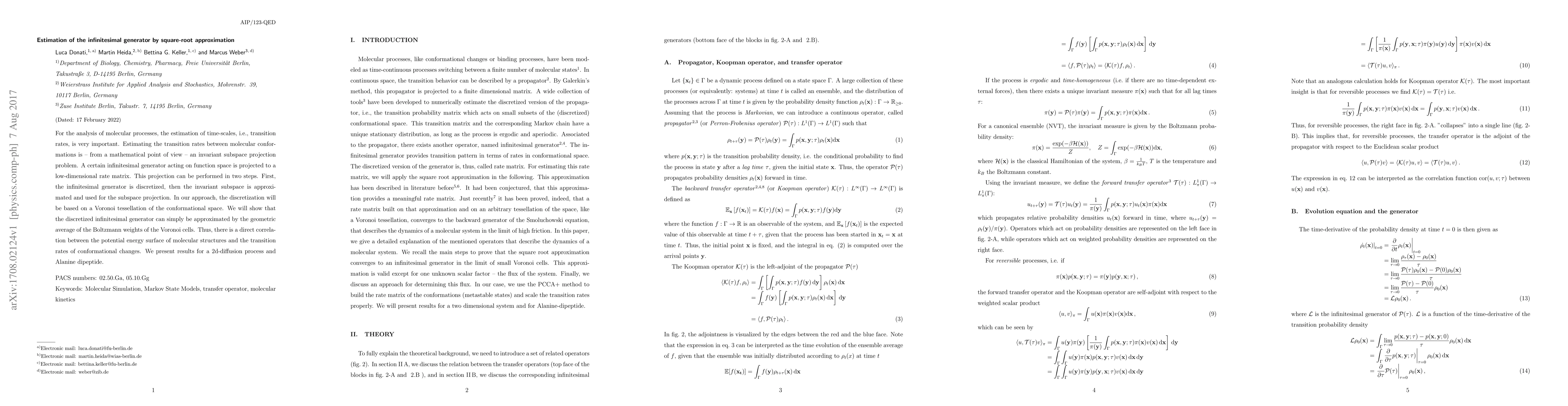 For the analysis of molecular processes, the estimation of time-scales, i.e., transition rates, is very important. Estimating the transition rates between molecular conformations is -- from a mathematical point of view -- an invariant subspace projection problem. A certain infinitesimal generator acting on function space is projected to a low-dimensional rate matrix. This projection can be performed in two steps. First, the infinitesimal generator is discretized, then the invariant subspace is approxi-mated and used for the subspace projection. In our approach, the discretization will be based on a Voronoi tessellation of the conformational space. We will show that the discretized infinitesimal generator can simply be approximated by the geometric average of the Boltzmann weights of the Voronoi cells. Thus, there is a direct correla-tion between the potential energy surface of molecular structures and the transition rates of conformational changes. We present results for a 2d-diffusion process and Alanine dipeptide.