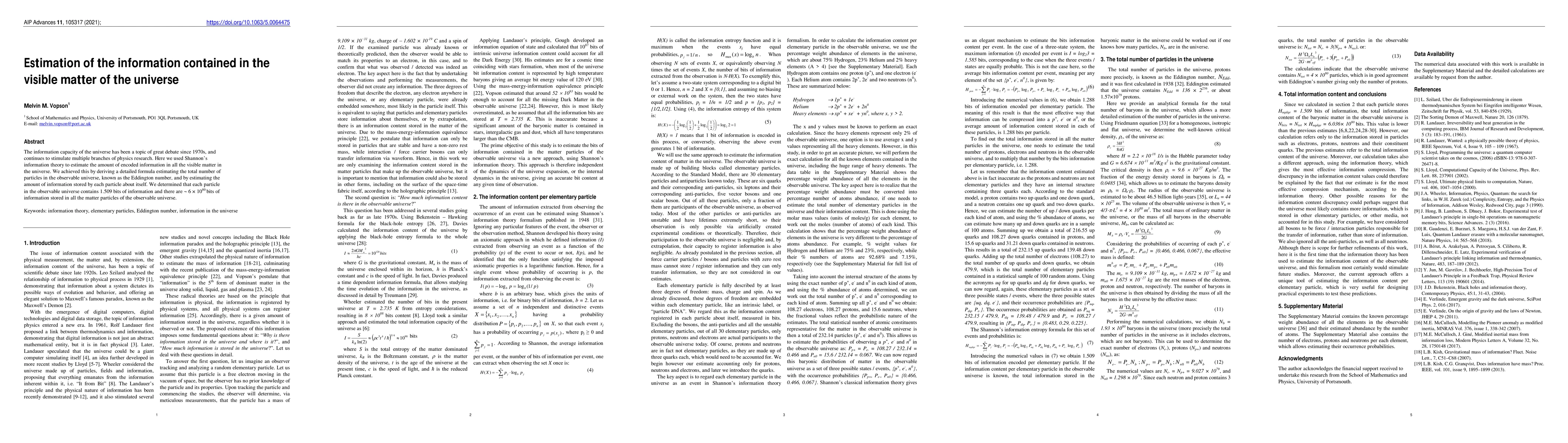 The information capacity of the universe has been a topic of great debate since 1970s, and continues to stimulate multiple branches of physics research. Here we used Shannon's information theory to estimate the amount of encoded information in all the visible matter in the universe. We achieved this by deriving a detailed formula estimating the total number of particles in the observable universe, known as the Eddington number, and by estimating the amount of information stored by each particle about itself. We determined that each particle in the observable universe contains 1.509 bits of information and there are 6 * 10 to power 80 bits of information stored in all the matter particles of the observable universe.