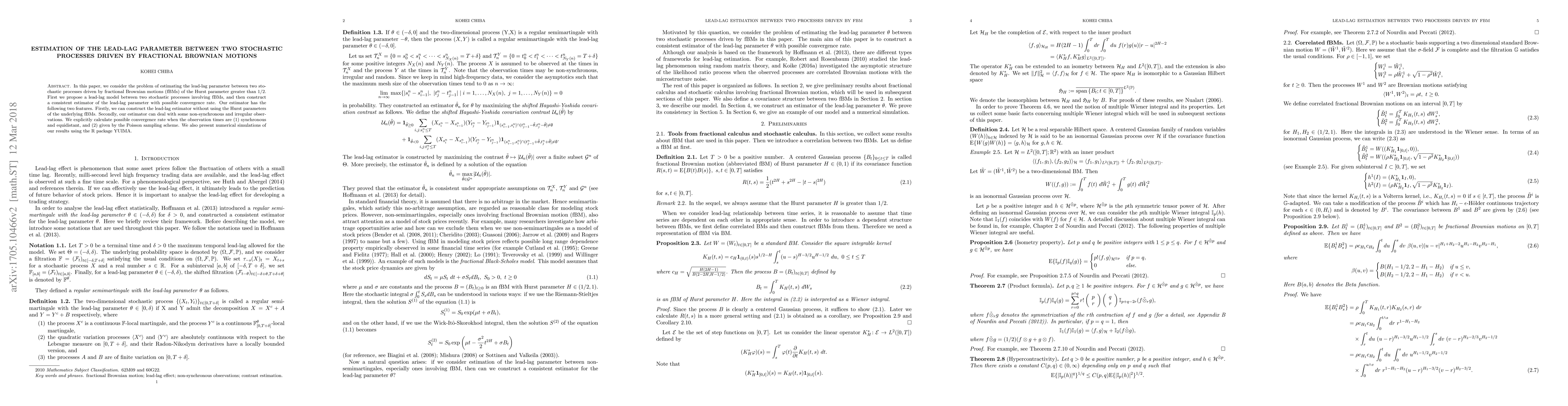 This paper proposes a consistent estimator for the lead-lag parameter between two stochastic processes driven by fractional Brownian motions, capable of handling non-synchronous observations. The estimator does not require the Hurst parameters and is tested under synchronous, equidistant observations and Poisson sampling schemes.