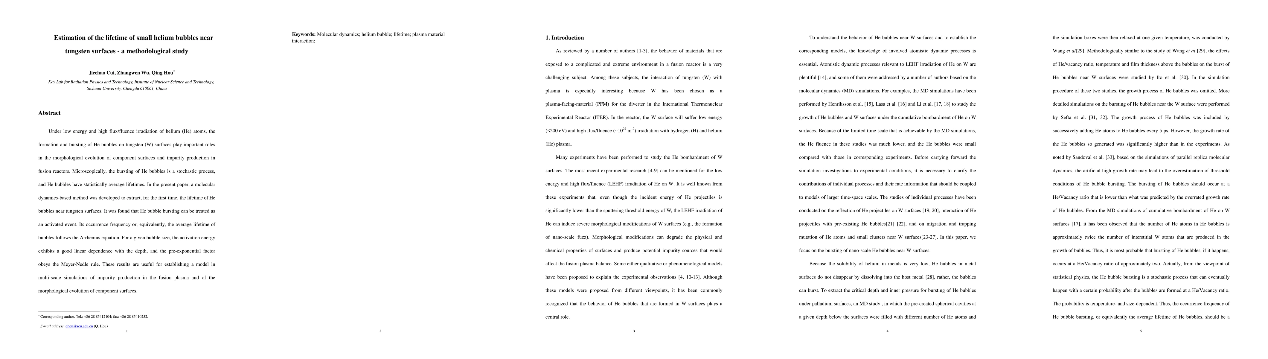 This study develops a molecular dynamics-based method to estimate the lifetime of helium bubbles near tungsten surfaces under irradiation, finding that bubble bursting follows an activated process described by the Arrhenius equation, with activation energy linearly dependent on depth. These insights are crucial for multi-scale simulations of impurity production and surface morphology in fusion reactors.