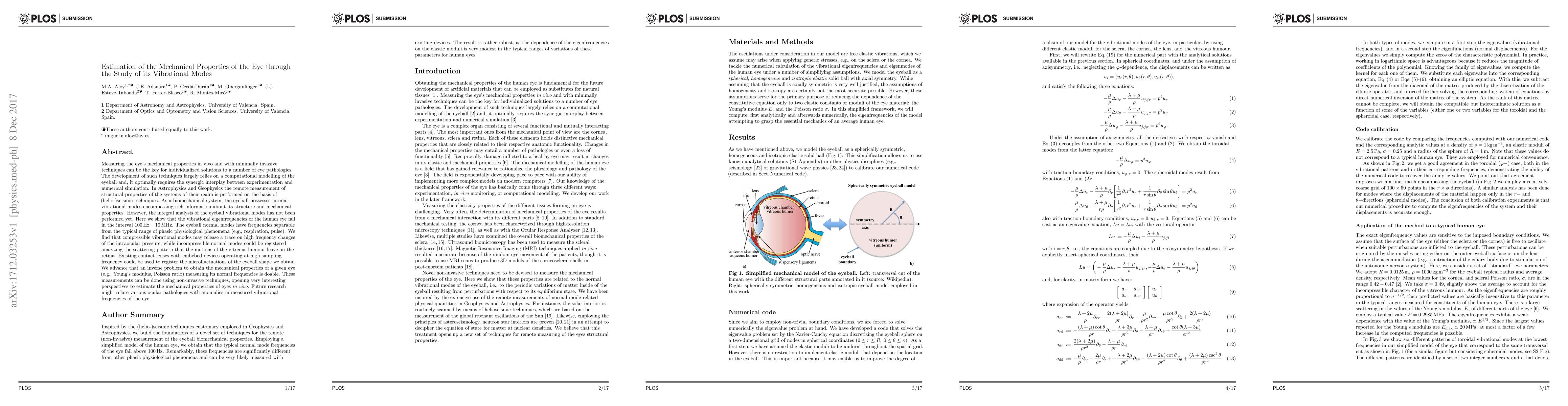Measuring the eye's mechanical properties in vivo and with minimally invasive techniques can be the key for individualized solutions to a number of eye pathologies. The development of such techniques largely relies on a computational modelling of the eyeball and, it optimally requires the synergic interplay between experimentation and numerical simulation. In Astrophysics and Geophysics the remote measurement of structural properties of the systems of their realm is performed on the basis of (helio-)seismic techniques. As a biomechanical system, the eyeball possesses normal vibrational modes encompassing rich information about its structure and mechanical properties. However, the integral analysis of the eyeball vibrational modes has not been performed yet. Here we develop a new finite difference method to compute both the spheroidal and, specially, the toroidal eigenfrequencies of the human eye. Using this numerical model, we show that the vibrational eigenfrequencies of the human eye fall in the interval 100 Hz - 10 MHz. We find that compressible vibrational modes may release a trace on high frequency changes of the intraocular pressure, while incompressible normal modes could be registered analyzing the scattering pattern that the motions of the vitreous humour leave on the retina. Existing contact lenses with embebed devices operating at high sampling frequency could be used to register the microfluctuations of the eyeball shape we obtain. We advance that an inverse problem to obtain the mechanical properties of a given eye (e.g., Young's modulus, Poisson ratio) measuring its normal frequencies is doable. These measurements can be done using non-invasive techniques, opening very interesting perspectives to estimate the mechanical properties of eyes in vivo. Future research might relate various ocular pathologies with anomalies in measured vibrational frequencies of the eye.