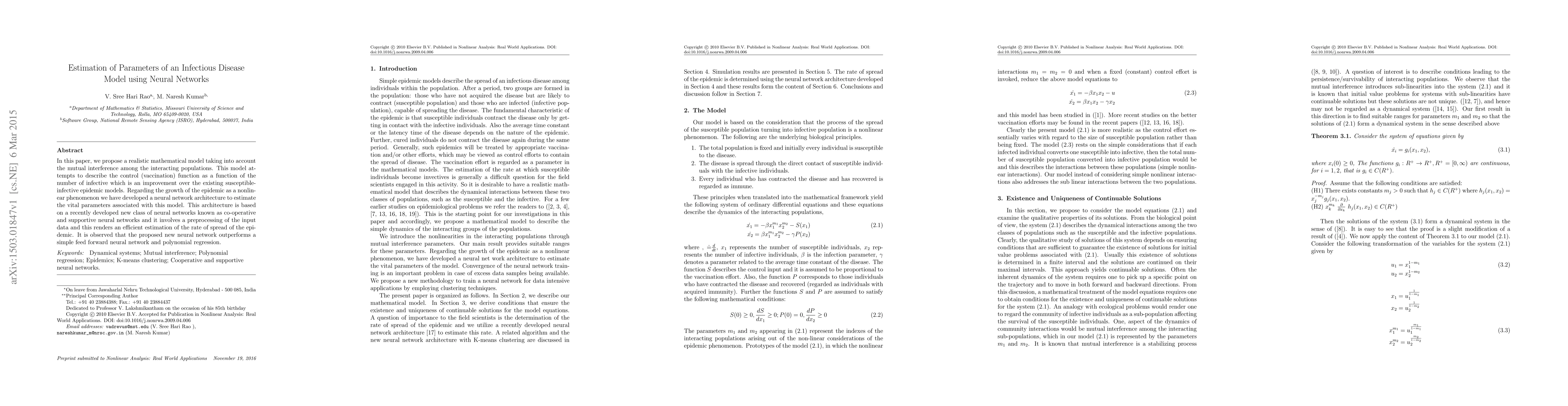 In this paper, we propose a realistic mathematical model taking into account the mutual interference among the interacting populations. This model attempts to describe the control (vaccination) function as a function of the number of infective individuals, which is an improvement over the existing susceptible infective epidemic models. Regarding the growth of the epidemic as a nonlinear phenomenon we have developed a neural network architecture to estimate the vital parameters associated with this model. This architecture is based on a recently developed new class of neural networks known as co-operative and supportive neural networks. The application of this architecture to the present study involves preprocessing of the input data, and this renders an efficient estimation of the rate of spread of the epidemic. It is observed that the proposed new neural network outperforms a simple feed-forward neural network and polynomial regression.