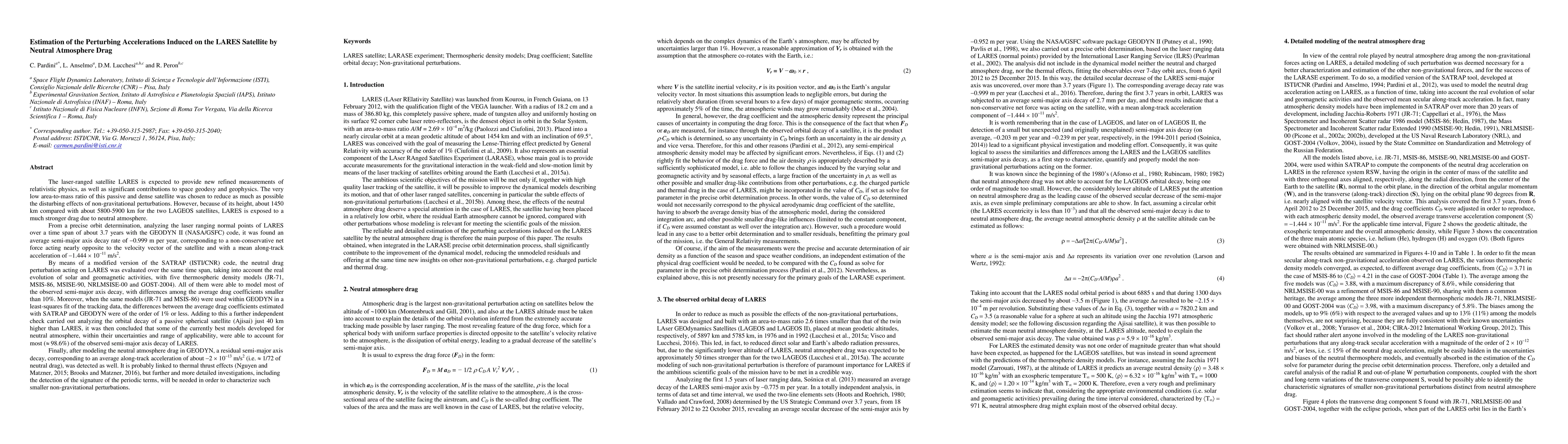 This study analyzed the impact of neutral atmosphere drag on the LARES satellite, finding an average semi-major axis decay rate of -0.999 m/yr, equivalent to -1.444 x 10^-11 m/s^2 along-track. Utilizing five thermospheric models and the SATRAP code, the researchers demonstrated that these models could accurately represent most of the observed decay (within 10% difference). An independent check with the Ajisai satellite corroborated these findings. Despite modeling the drag, a residual decay was detected, suggesting unaccounted-for forces.
