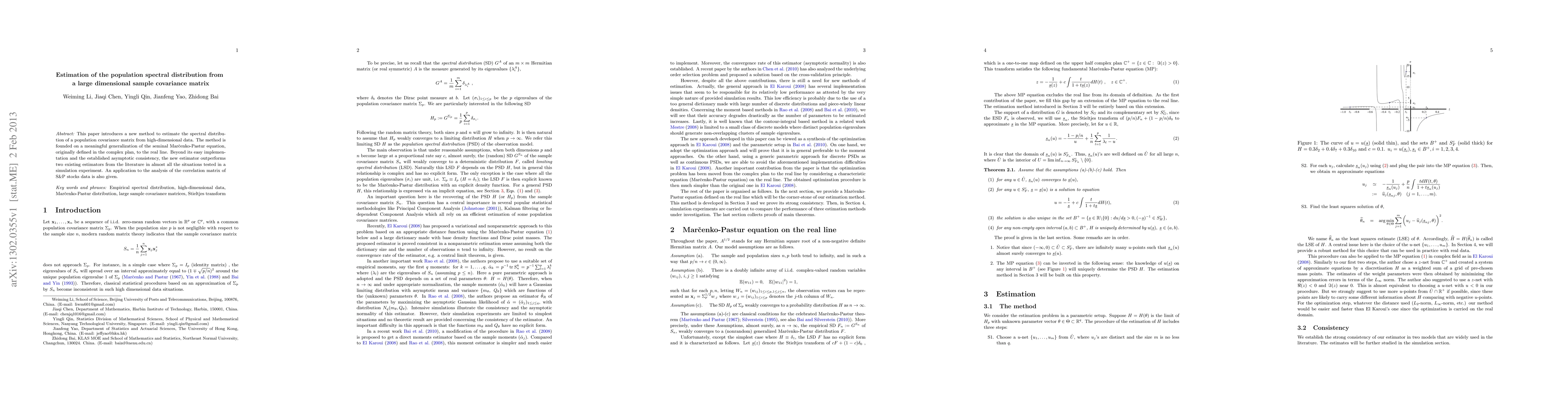 This paper proposes a novel method for estimating the spectral distribution of a population covariance matrix from high-dimensional data, generalizing the Marcenko-Pastur equation to the real line. The new estimator demonstrates superior performance over existing methods in simulations and is applied to analyze the correlation matrix of S&P stocks data.