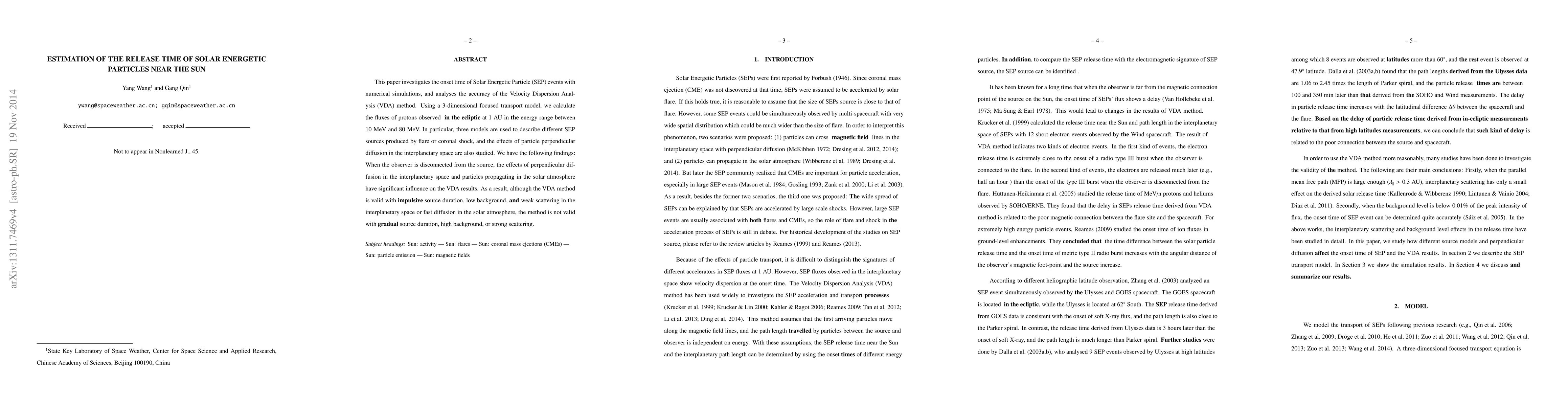 This paper uses numerical simulations to estimate the onset time of Solar Energetic Particle events and evaluates the Velocity Dispersion Analysis method. It finds that while the VDA method is effective under certain conditions, it fails when the observer is disconnected from the source, especially with gradual source duration, high background, or strong scattering.