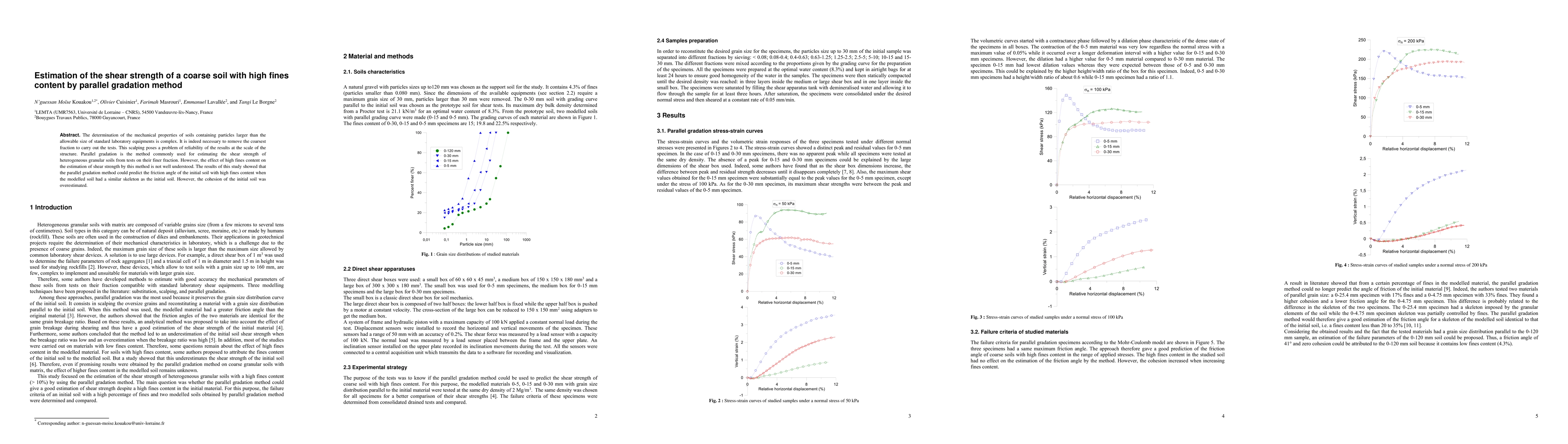 The determination of the mechanical properties of soils containing particles larger than the allowable size of standard laboratory equipments is complex. It is indeed necessary to remove the coarsest fraction to carry out the tests. This scalping poses a problem of reliability of the results at the scale of the structure. Parallel gradation is the method commonly used for estimating the shear strength of heterogeneous granular soils from tests on their finer fraction. However, the effect of high fines content on the estimation of shear strength by this method is not well understood. The results of this study showed that the parallel gradation method could predict the friction angle of the initial soil with high fines content when the modelled soil had a similar skeleton as the initial soil. However, the cohesion of the initial soil was overestimated.