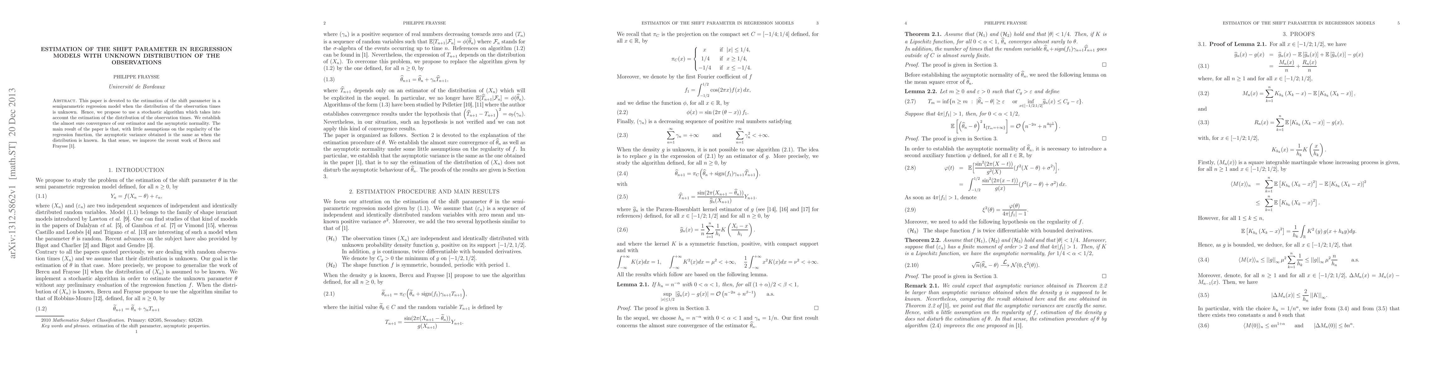 This paper is devoted to the estimation of the shift parameter in a semiparametric regression model when the distribution of the observation times is unknown. Hence, we propose to use a stochastic algorithm which takes into account the estimation of the distribution of the observation times. We establish the almost sure convergence of our estimator and the asymptotic normality. The main result of the paper is that, with little assumptions on the regularity of the regression function, the asymptotic variance obtained is the same as when the distribution is known. In that sense, we improve the recent work of Bercu and Fraysse.
