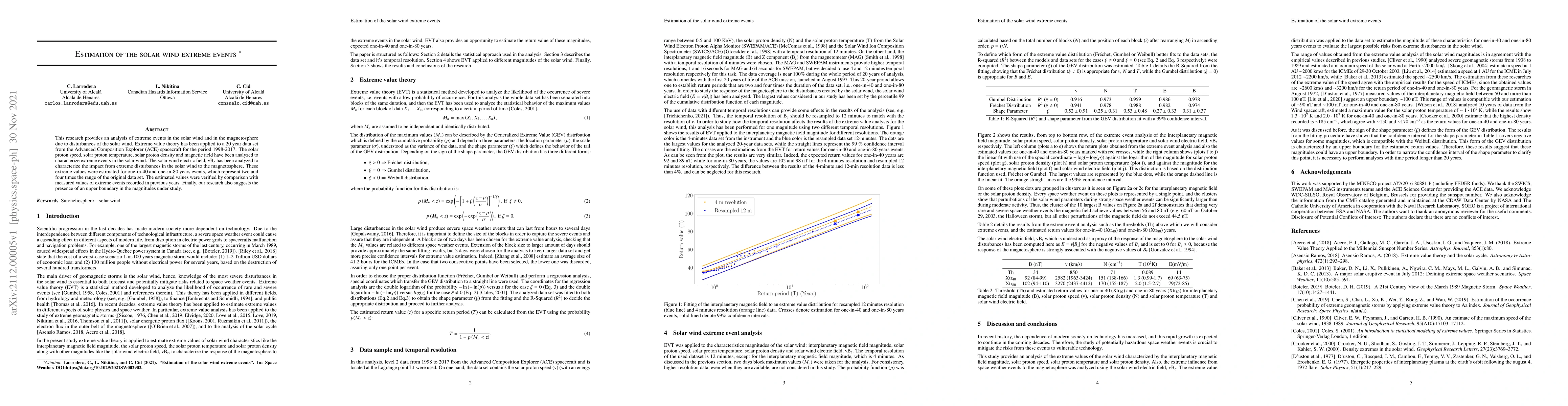 This research uses extreme value theory to analyze 20 years of solar wind data from the ACE spacecraft, estimating extreme solar wind events and their impacts on the magnetosphere for rare occurrences. The analysis suggests an upper boundary for the magnitudes studied.