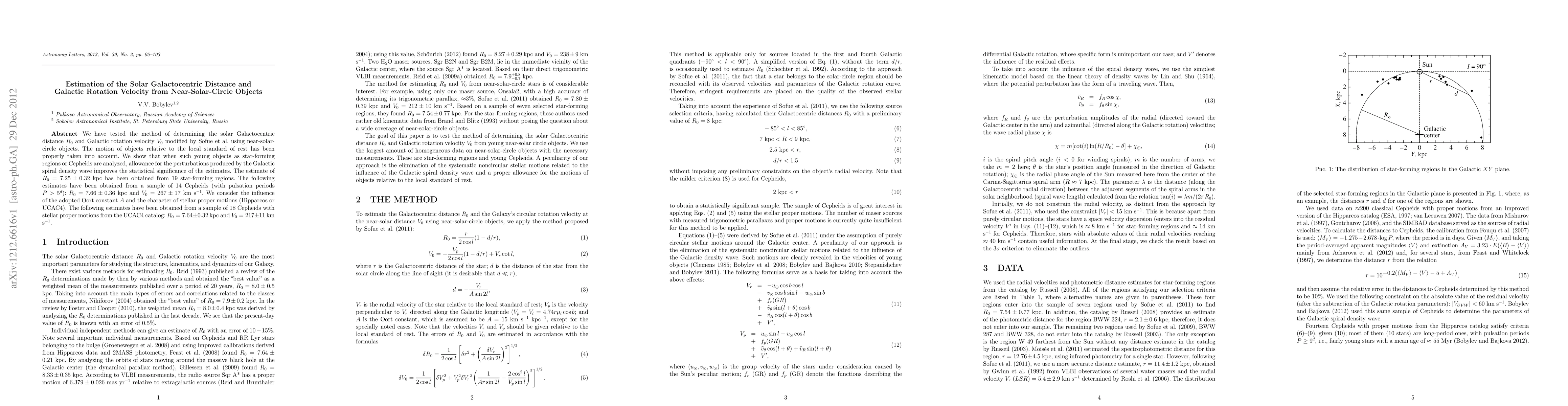 This paper estimates the solar Galactocentric distance and rotation velocity using near-solar-circle objects, finding R_0=7.25±0.32 kpc from star-forming regions and R_0=7.66±0.36 kpc, V_0=267±17 km s^{-1} from Cepheids, with improved accuracy when accounting for Galactic spiral density wave perturbations.