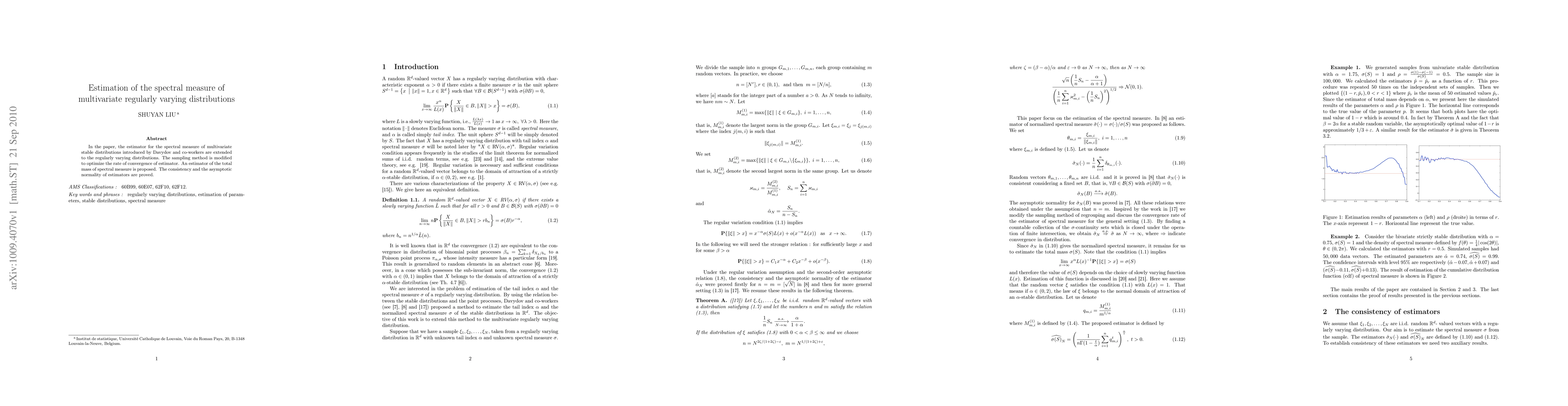 This paper extends estimators for the spectral measure of multivariate stable distributions to regularly varying distributions, optimizing the sampling method for improved convergence rates. The authors propose a new estimator for the total mass of the spectral measure and prove its consistency and asymptotic normality.