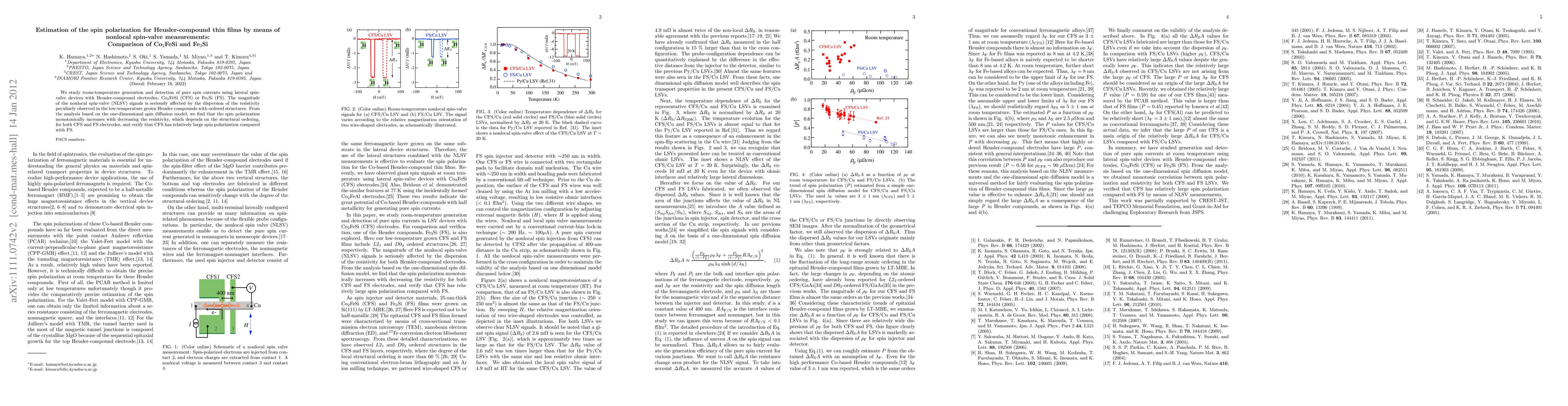 This paper investigates the spin polarization in thin films of Heusler compounds Co₂FeSi and Fe₃Si using nonlocal spin-valve measurements. It finds that spin polarization increases with decreasing resistivity, which is influenced by structural ordering, with Co₂FeSi showing higher spin polarization than Fe₃Si.