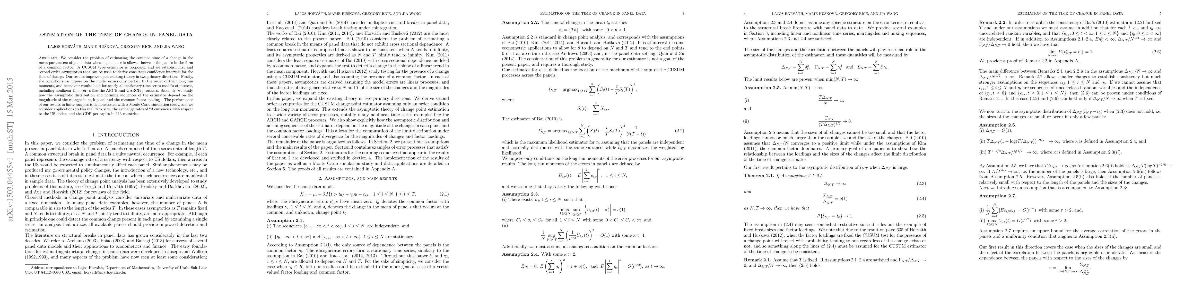 We consider the problem of estimating the common time of a change in the mean parameters of panel data when dependence is allowed between the panels in the form of a common factor. A CUSUM type estimator is proposed, and we establish first and second order asymptotics that can be used to derive consistent confidence intervals for the time of change. Our results improve upon existing theory in two primary directions. Firstly, the conditions we impose on the model errors only pertain to the order of their long run moments, and hence our results hold for nearly all stationary time series models of interest, including nonlinear time series like the ARCH and GARCH processes. Secondly, we study how the asymptotic distribution and norming sequences of the estimator depend on the magnitude of the changes in each panel and the common factor loadings. The performance of our results in finite samples is demonstrated with a Monte Carlo simulation study, and we consider applications to two real data sets: the exchange rates of 23 currencies with respect to the US dollar, and the GDP per capita in 113 countries.