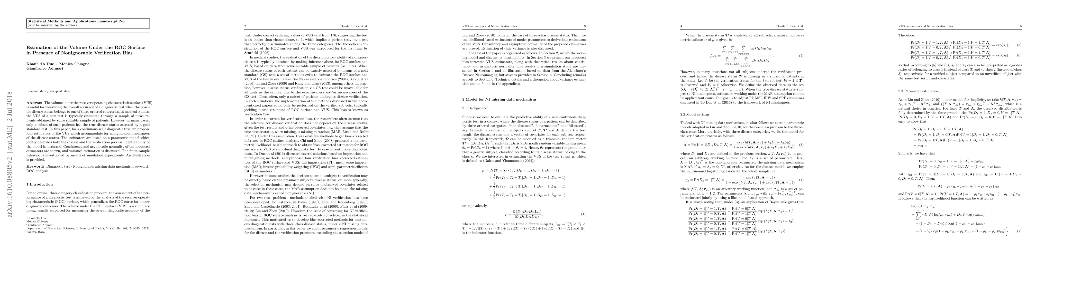 The volume under the receiver operating characteristic surface (VUS) is useful for measuring the overall accuracy of a diagnostic test when the possible disease status belongs to one of three ordered categories. In medical studies, the VUS of a new test is typically estimated through a sample of measurements obtained by some suitable sample of patients. However, in many cases, only a subset of such patients has the true disease status assessed by a gold standard test. In this paper, for a continuous-scale diagnostic test, we propose four estimators of the VUS which accommodate for nonignorable missingness of the disease status. The estimators are based on a parametric model which jointly describes both the disease and the verification process. Identifiability of the model is discussed. Consistency and asymptotic normality of the proposed estimators are shown, and variance estimation is discussed. The finite-sample behavior is investigated by means of simulation experiments. An illustration is provided.