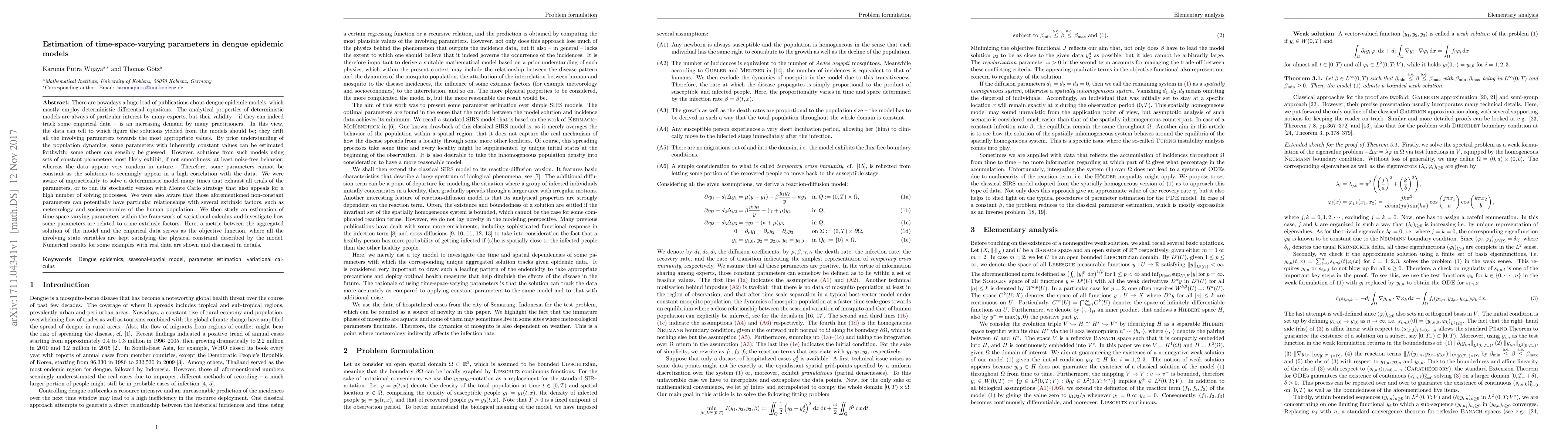 There are nowadays a huge load of publications about dengue epidemic models, which mostly employ deterministic differential equations. The analytical properties of deterministic models are always of particular interest by many experts, but their validity - if they can indeed track some empirical data - is an increasing demand by many practitioners. In this view, the data can tell to which figure the solutions yielded from the models should be; they drift all the involving parameters towards the most appropriate values. By prior understanding of the population dynamics, some parameters with inherently constant values can be estimated forthwith; some others can sensibly be guessed. However, solutions from such models using sets of constant parameters most likely exhibit, if not smoothness, at least noise-free behavior; whereas the data appear very random in nature. Therefore, some parameters cannot be constant as the solutions to seemingly appear in a high correlation with the data. We were aware of impracticality to solve a deterministic model many times that exhaust all trials of the parameters, or to run its stochastic version with Monte Carlo strategy that also appeals for a high number of solving processes. We were also aware that those aforementioned non-constant parameters can potentially have particular relationships with several extrinsic factors, such as meteorology and socioeconomics of the human population. We then study an estimation of time-space-varying parameters within the framework of variational calculus and investigate how some parameters are related to some extrinsic factors. Numerical results for some examples with real data are shown and discussed in details.