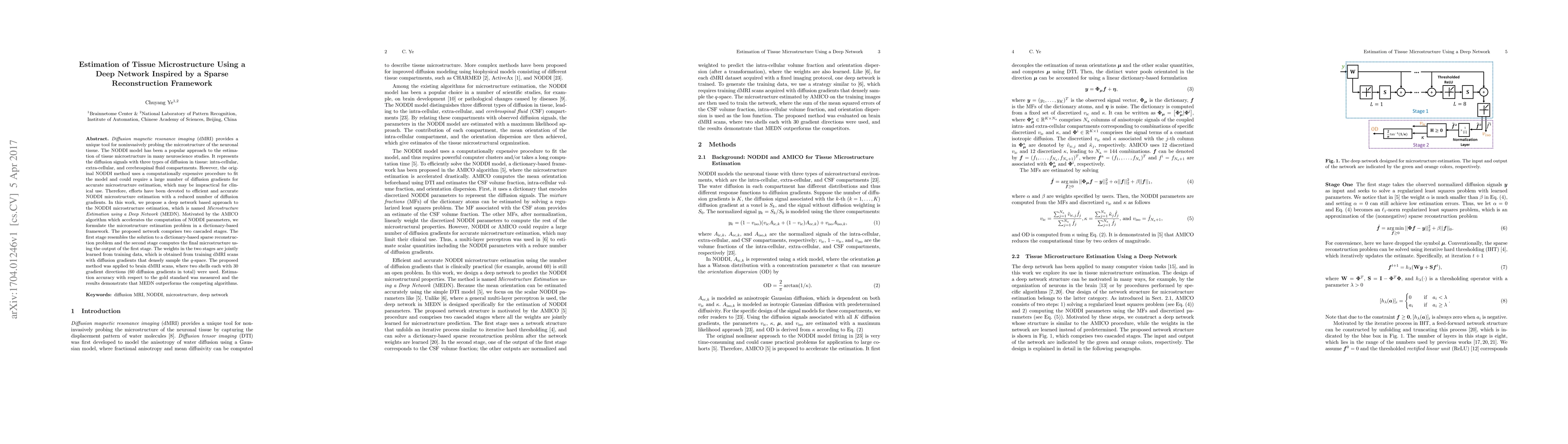 This paper proposes a deep network named MEDN for efficient estimation of tissue microstructure using dMRI, inspired by the sparse reconstruction framework of the AMICO algorithm. The method outperforms competing algorithms in accuracy, using fewer diffusion gradients, thus making it more practical for clinical applications.