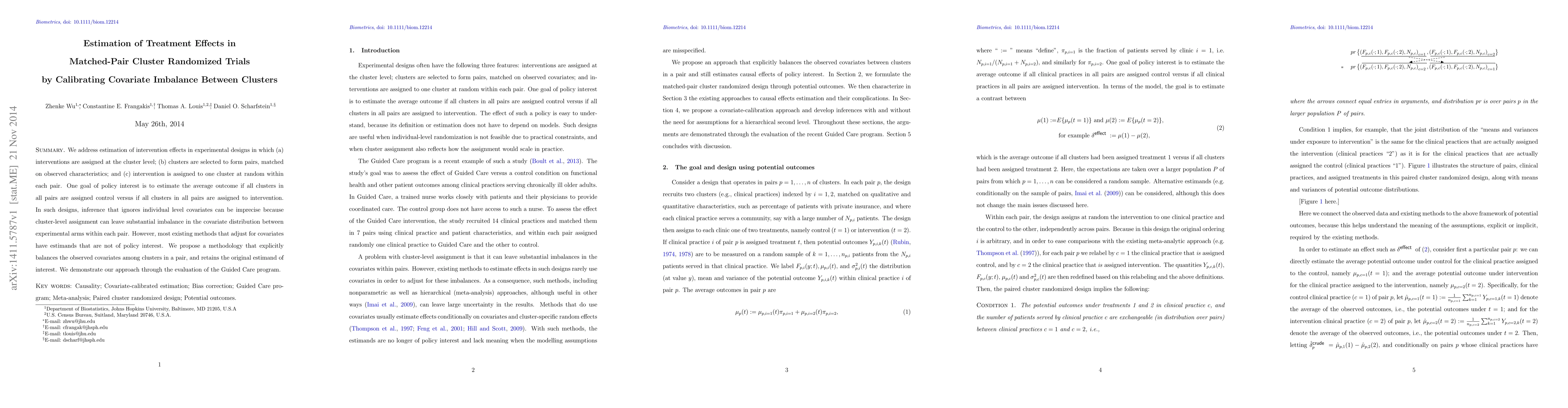 This paper presents a method to accurately estimate treatment effects in cluster randomized trials with matched pairs, addressing covariate imbalance. It introduces a novel approach that balances observed covariates within pairs while retaining the policy-relevant estimand, demonstrated via the Guided Care program evaluation.