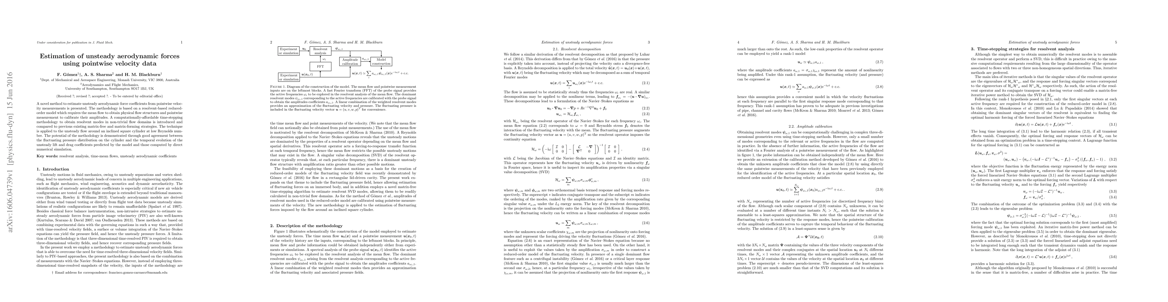 This paper introduces a novel method for estimating unsteady aerodynamic forces using pointwise velocity data, based on a resolvent-based reduced-order model. The method shows good agreement with direct numerical simulation results for the unsteady flow around an inclined square cylinder, demonstrating its potential for computational efficiency.