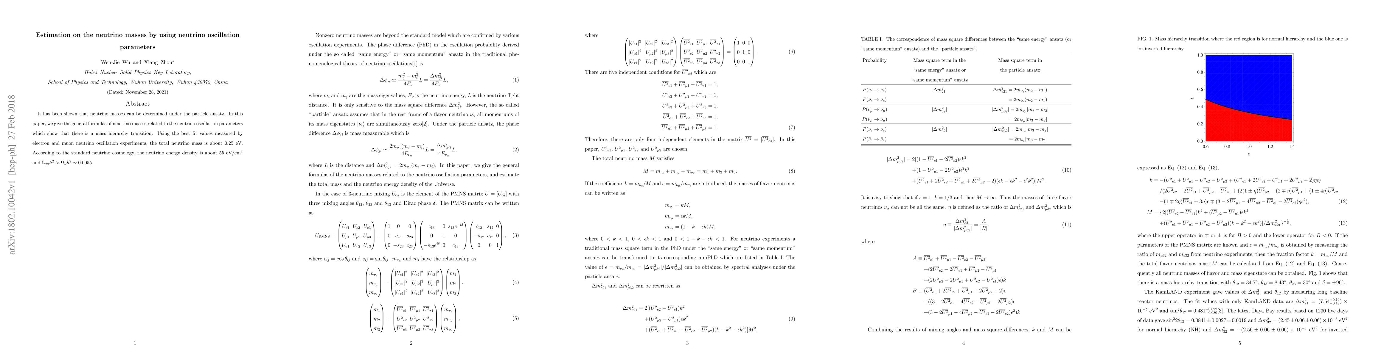 It has been shown that neutrino masses can be determined under the particle ansatz. In this paper, we give the general formulas of neutrino masses related to the neutrino oscillation parameters which show that there is a mass hierarchy transition. Using the best fit values measured by electron and muon neutrino oscillation experiments, the total neutrino mass is about 0.25 eV. According to the standard neutrino cosmology, the neutrino energy density is about 55 eV/cm$^3$ and $\Omega_m h^2>\Omega_\nu h^2\sim 0.0055$.