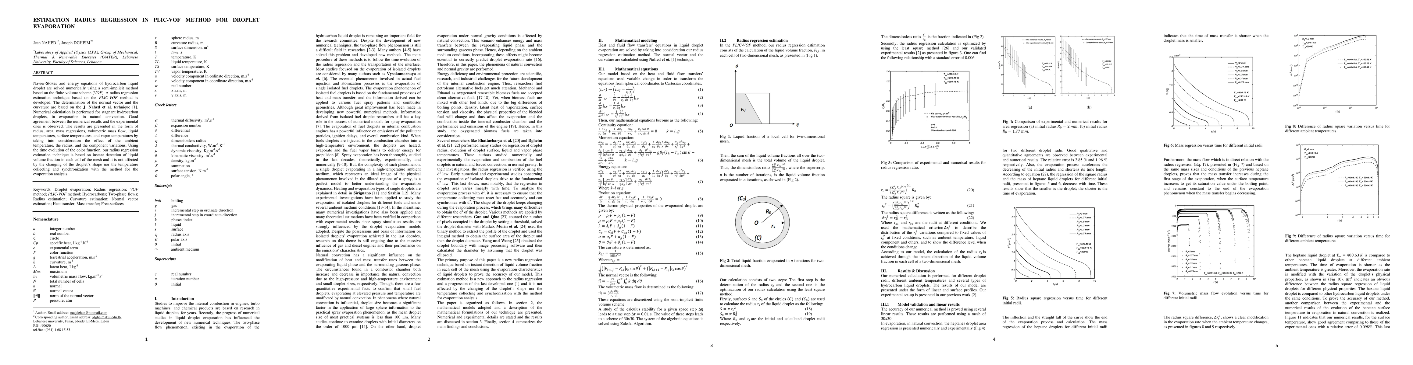 This paper presents a novel PLIC-VOF method for numerically solving Navier-Stokes and energy equations to model hydrocarbon droplet evaporation in natural convection. The technique enables precise tracking of droplet radius regression unaffected by shape and temperature changes.