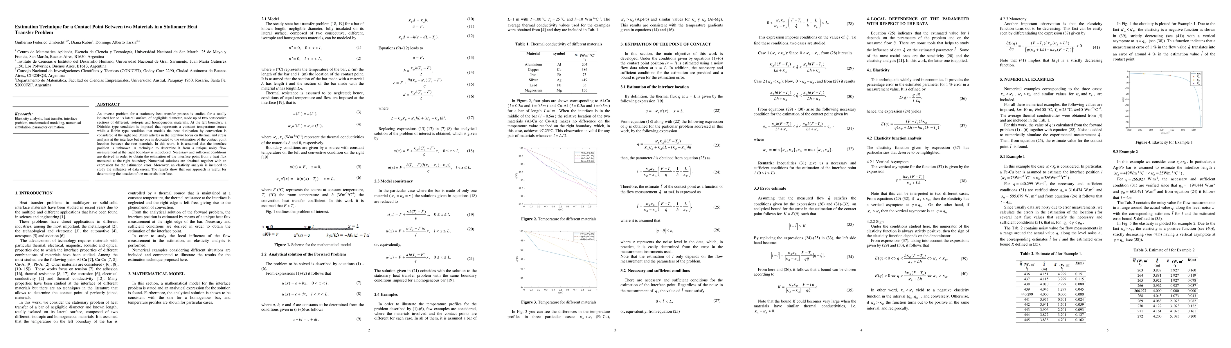 An inverse problem for a stationary heat transfer process is studied for a totally isolated bar on its lateral surface, of negligible diameter, made up of two consecutive sections of different, isotropic and homogeneous materials. At the left boundary, a Dirichlet type condition is imposed that represents a constant temperature source while a Robin type condition that models the heat dissipation by convection is considered at the right one. Many articles in the literature focus on thermal and stress analysis at the interface but no one is dedicated to the estimation of the contact point location between the two materials. In this work, it is assumed that the interface position is unknown. A technique to determine it from a unique noisy flow measurement at the right boundary is introduced. Necessary and sufficient conditions are derived in order to obtain the estimation of the interface point from a heat flux measured at the right boundary. Numerical solutions are obtained together with an expression for the estimation error. Moreover, an elasticity analysis is included to study the influence of data errors. The results show that our approach is useful for determining the location of the materials interface.