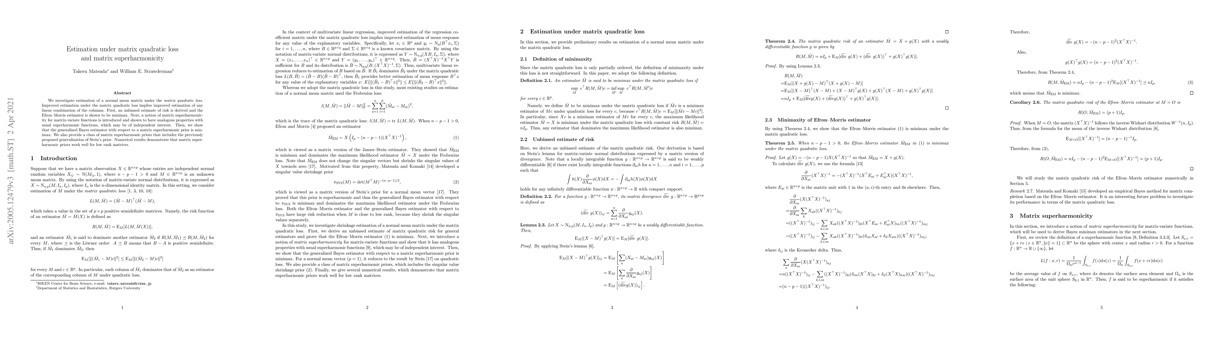 This paper explores estimation of a normal mean matrix under matrix quadratic loss, deriving an unbiased risk estimate and proving the Efron-Morris estimator as minimax. It introduces matrix superharmonicity, showing its properties analogous to usual superharmonic functions, and demonstrates that the generalized Bayes estimator with a matrix superharmonic prior is also minimax, with numerical results supporting its effectiveness for low rank matrices.