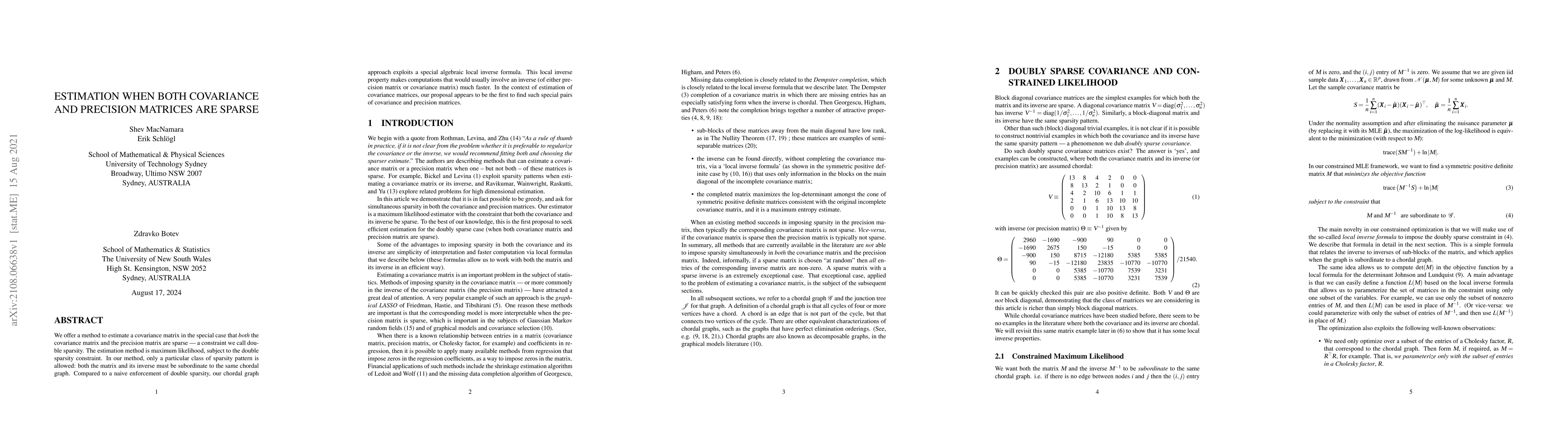 We offer a method to estimate a covariance matrix in the special case that \textit{both} the covariance matrix and the precision matrix are sparse --- a constraint we call double sparsity. The estimation method is maximum likelihood, subject to the double sparsity constraint. In our method, only a particular class of sparsity pattern is allowed: both the matrix and its inverse must be subordinate to the same chordal graph. Compared to a naive enforcement of double sparsity, our chordal graph approach exploits a special algebraic local inverse formula. This local inverse property makes computations that would usually involve an inverse (of either precision matrix or covariance matrix) much faster. In the context of estimation of covariance matrices, our proposal appears to be the first to find such special pairs of covariance and precision matrices.
