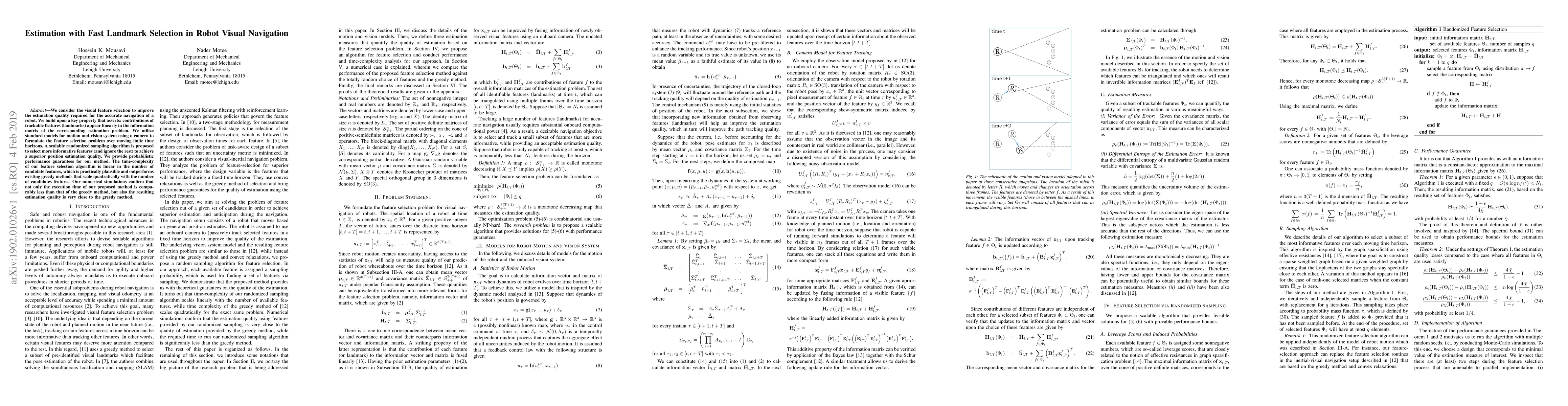 We consider the visual feature selection to improve the estimation quality required for the accurate navigation of a robot. We build upon a key property that asserts: contributions of trackable features (landmarks) appear linearly in the information matrix of the corresponding estimation problem. We utilize standard models for motion and vision system using a camera to formulate the feature selection problem over moving finite time horizons. A scalable randomized sampling algorithm is proposed to select more informative features (and ignore the rest) to achieve a superior position estimation quality. We provide probabilistic performance guarantees for our method. The time-complexity of our feature selection algorithm is linear in the number of candidate features, which is practically plausible and outperforms existing greedy methods that scale quadratically with the number of candidates features. Our numerical simulations confirm that not only the execution time of our proposed method is comparably less than that of the greedy method, but also the resulting estimation quality is very close to the greedy method.