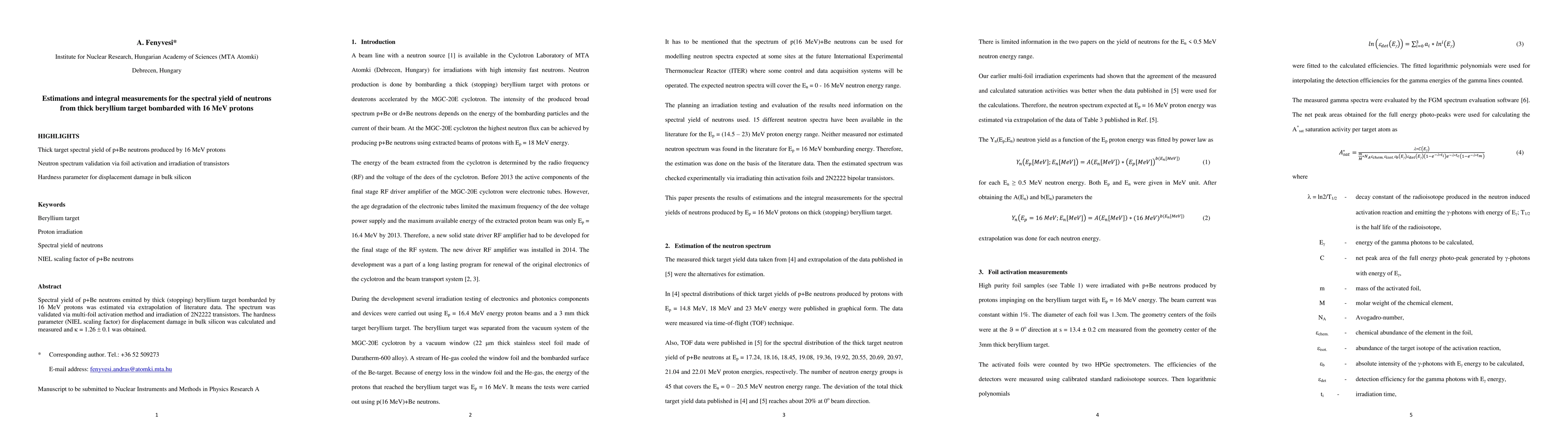 This study estimates the spectral yield of neutrons from a thick beryllium target bombarded with 16 MeV protons, validated through multi-foil activation and transistor irradiation. The NIEL scaling factor for silicon displacement damage was calculated, yielding a kappa value of 1.26 ± 0.1.