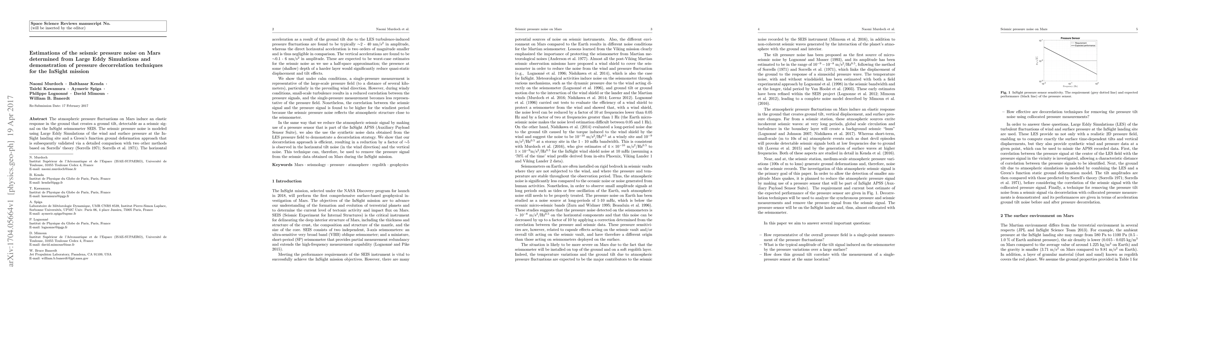 This paper models seismic pressure noise on Mars using Large Eddy Simulations and validates it against Sorrells' theory, finding horizontal accelerations from pressure fluctuations to be ~2-40 nm/s², negligible compared to the direct horizontal acceleration. The study also demonstrates pressure decorrelation techniques, showing that seismic pressure noise reflects atmospheric structure near the seismometer.