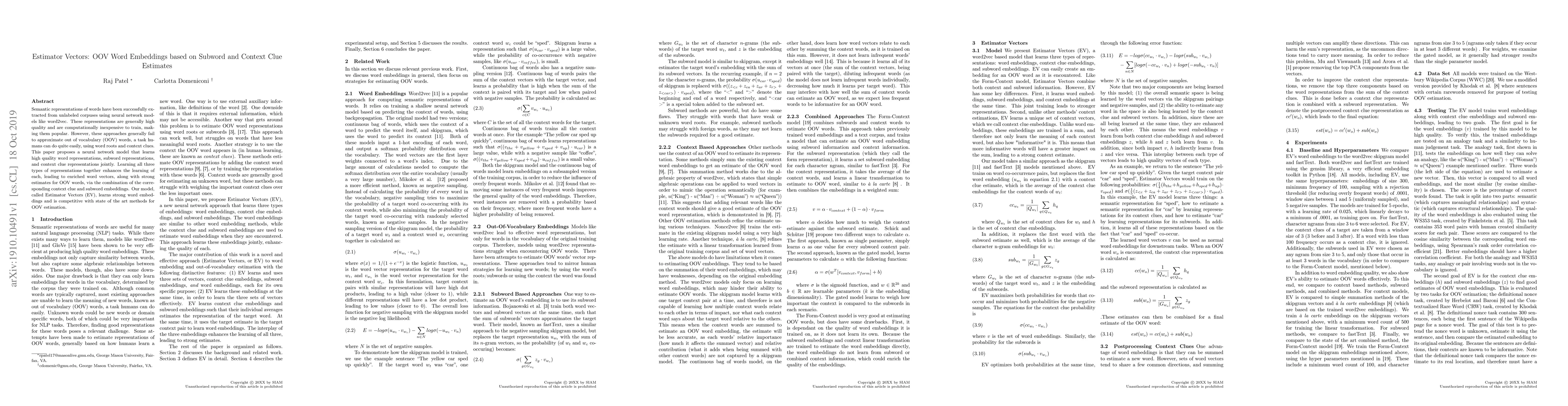 Semantic representations of words have been successfully extracted from unlabeled corpuses using neural network models like word2vec. These representations are generally high quality and are computationally inexpensive to train, making them popular. However, these approaches generally fail to approximate out of vocabulary (OOV) words, a task humans can do quite easily, using word roots and context clues. This paper proposes a neural network model that learns high quality word representations, subword representations, and context clue representations jointly. Learning all three types of representations together enhances the learning of each, leading to enriched word vectors, along with strong estimates for OOV words, via the combination of the corresponding context clue and subword embeddings. Our model, called Estimator Vectors (EV), learns strong word embeddings and is competitive with state of the art methods for OOV estimation.