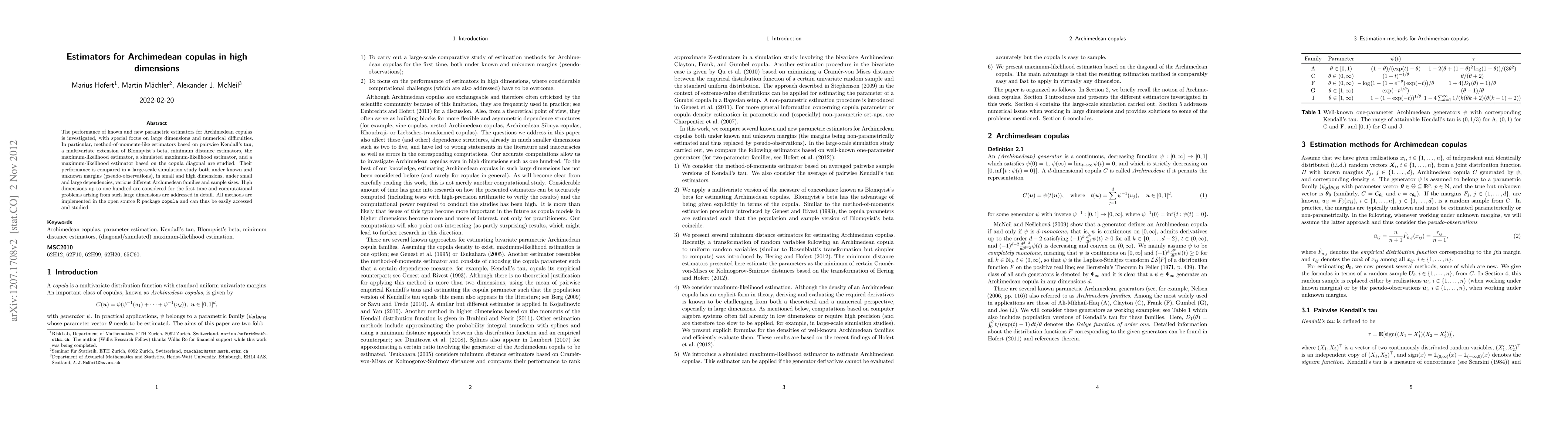 The performance of known and new parametric estimators for Archimedean copulas is investigated, with special focus on large dimensions and numerical difficulties. In particular, method-of-moments-like estimators based on pairwise Kendall's tau, a multivariate extension of Blomqvist's beta, minimum distance estimators, the maximum-likelihood estimator, a simulated maximum-likelihood estimator, and a maximum-likelihood estimator based on the copula diagonal are studied. Their performance is compared in a large-scale simulation study both under known and unknown margins (pseudo-observations), in small and high dimensions, under small and large dependencies, various different Archimedean families and sample sizes. High dimensions up to one hundred are considered for the first time and computational problems arising from such large dimensions are addressed in detail. All methods are implemented in the open source \R{} package \pkg{copula} and can thus be easily accessed and studied.