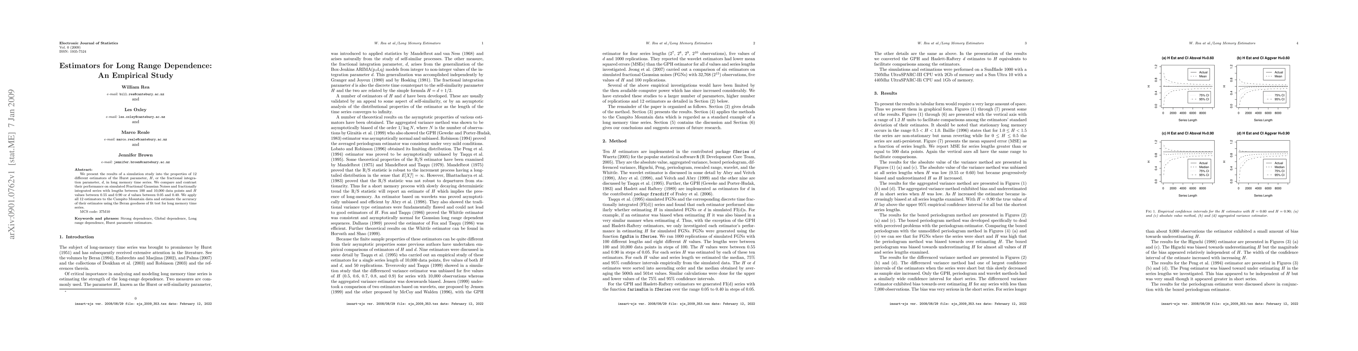 We present the results of a simulation study into the properties of 12 different estimators of the Hurst parameter, $H$, or the fractional integration parameter, $d$, in long memory time series. We compare and contrast their performance on simulated Fractional Gaussian Noises and fractionally integrated series with lengths between 100 and 10,000 data points and $H$ values between 0.55 and 0.90 or $d$ values between 0.05 and 0.40. We apply all 12 estimators to the Campito Mountain data and estimate the accuracy of their estimates using the Beran goodness of fit test for long memory time series. MCS code: 37M10