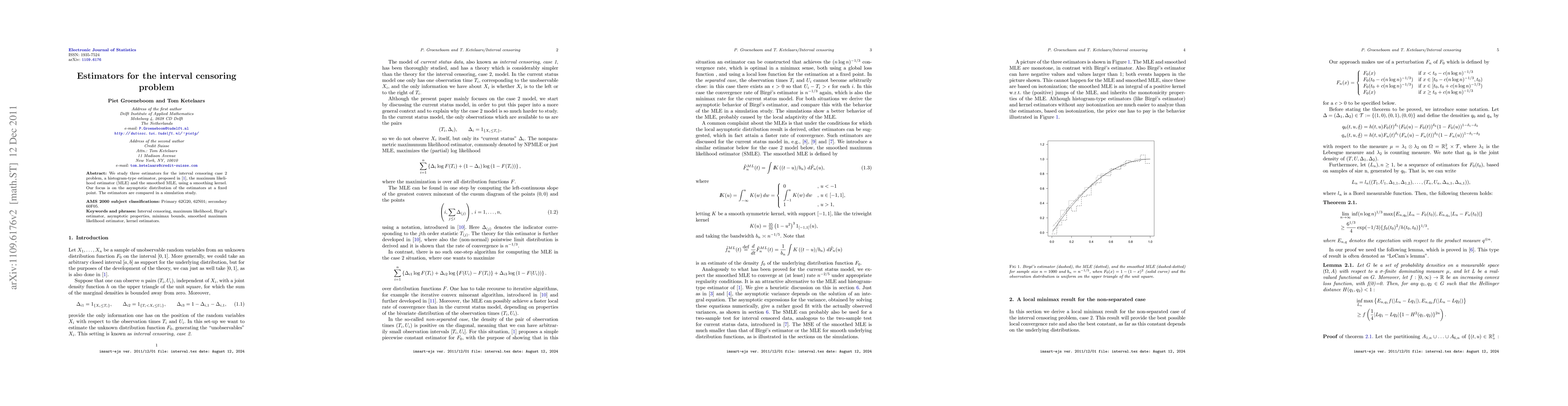 Researchers studied three estimators for interval censoring problems: a histogram-type estimator, maximum likelihood estimator (MLE), and smoothed MLE with a smoothing kernel. They found that the estimators were compared in a simulation study to examine their asymptotic distribution at fixed points.