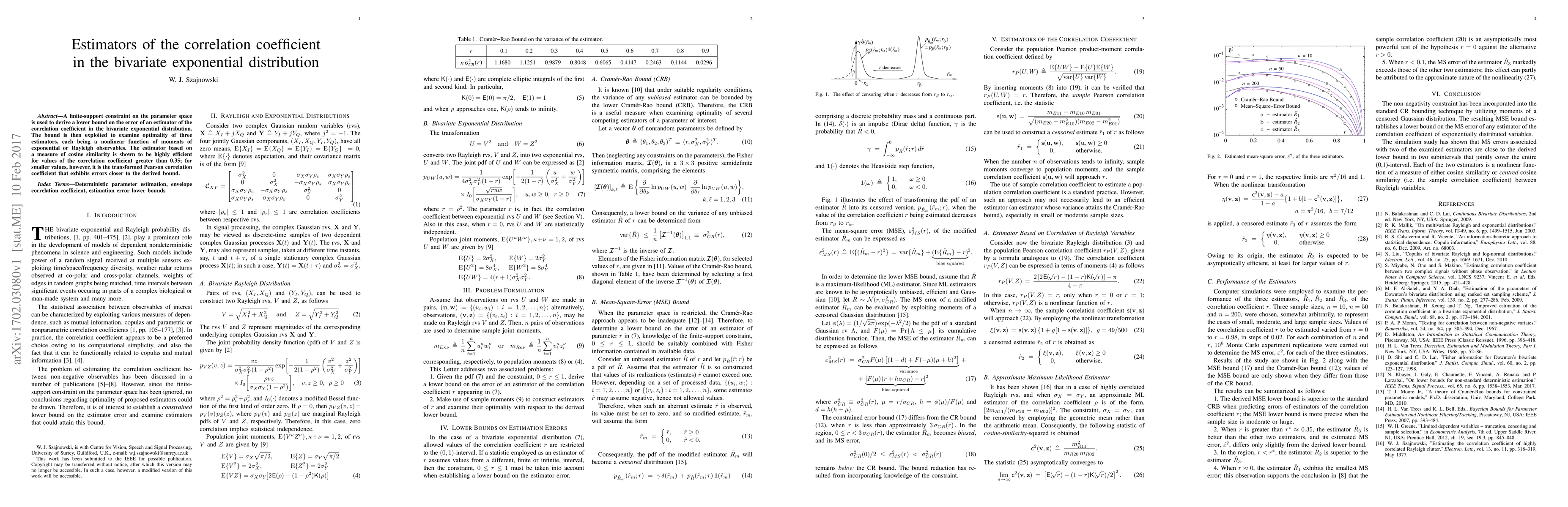 A finite-support constraint on the parameter space is used to derive a lower bound on the error of an estimator of the correlation coefficient in the bivariate exponential distribution. The bound is then exploited to examine optimality of three estimators, each being a nonlinear function of moments of exponential or Rayleigh observables. The estimator based on a measure of cosine similarity is shown to be highly efficient for values of the correlation coefficient greater than 0.35; for smaller values, however, it is the transformed Pearson correlation coefficient that exhibits errors closer to the derived bound.