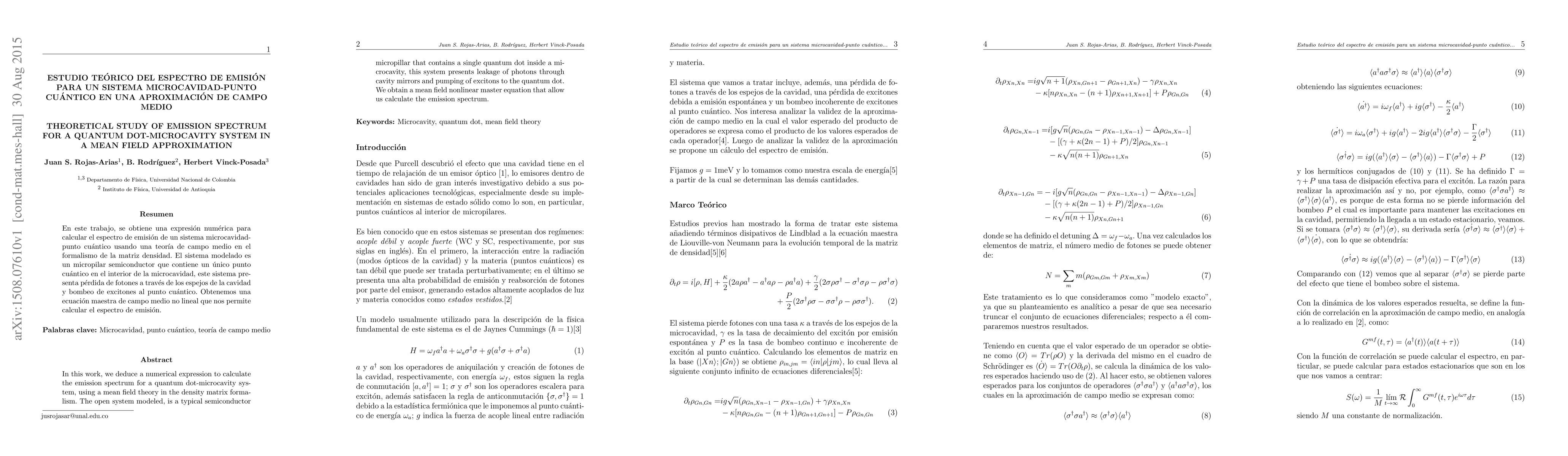 En este trabajo, se obtiene una expresi\'on num\'erica para calcular el espectro de emisi\'on de un sistema microcavidad-punto cu\'antico usando una teor\'ia de campo medio en el formalismo de la matriz densidad. El sistema modelado es un micropilar semiconductor que contiene un \'unico punto cu\'antico en el interior de la microcavidad, este sistema presenta p\'erdida de fotones a trav\'es de los espejos de la cavidad y bombeo de excitones al punto cu\'antico. Obtenemos una ecuaci\'on maestra de campo medio no lineal que nos permite calcular el espectro de emisi\'on. In this work, we deduce a numerical expression to calculate the emission spectrum for a quantum dot-microcavity system, using a mean field theory in the density matrix formalism. The open system modeled, is a typical semiconductor micropillar that contains a single quantum dot inside a microcavity, this system presents leakage of photons through cavity mirrors and pumping of excitons to the quantum dot. We obtain a mean field nonlinear master equation that allow us calculate the emission spectrum.