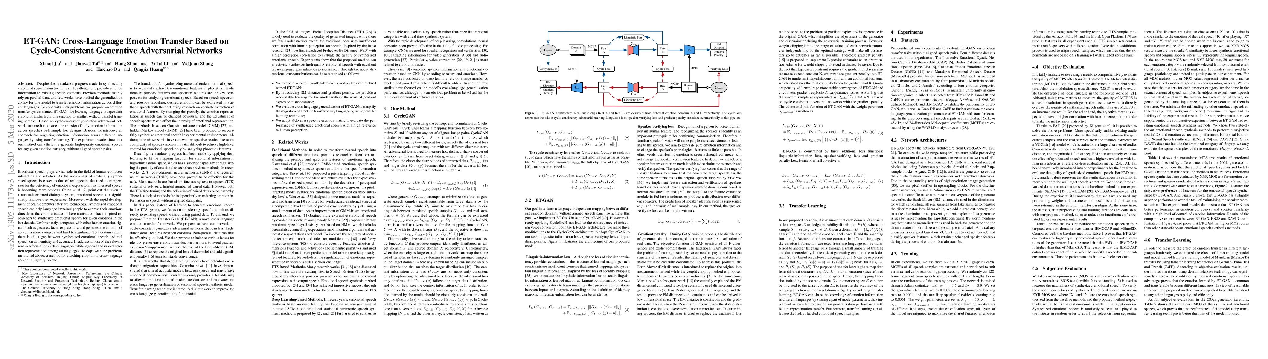 Summary: ET-GAN is a novel emotion transfer system leveraging cycle-consistent generative adversarial networks to transfer emotion information across languages without parallel training data. It achieves high-quality emotional speech synthesis by focusing on language-independent emotion transfer and employing transfer learning for cross-language emotion migration.