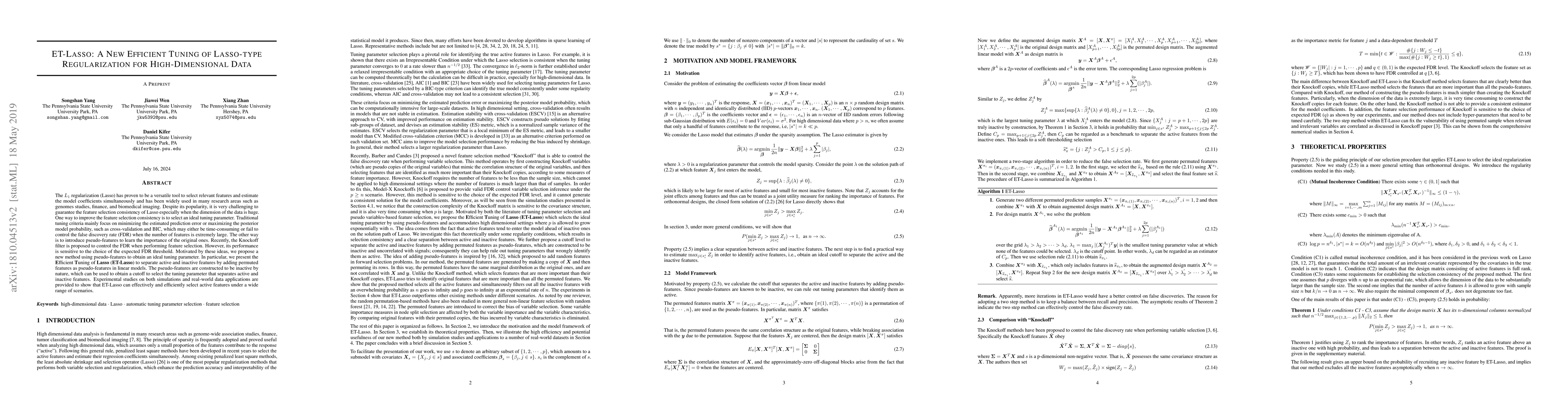 The ET-Lasso method introduces pseudo-features to determine an optimal tuning parameter for Lasso regularization, enhancing feature selection consistency in high-dimensional data. Experimental results demonstrate that ET-Lasso effectively separates active from inactive features and controls the false discovery rate efficiently.