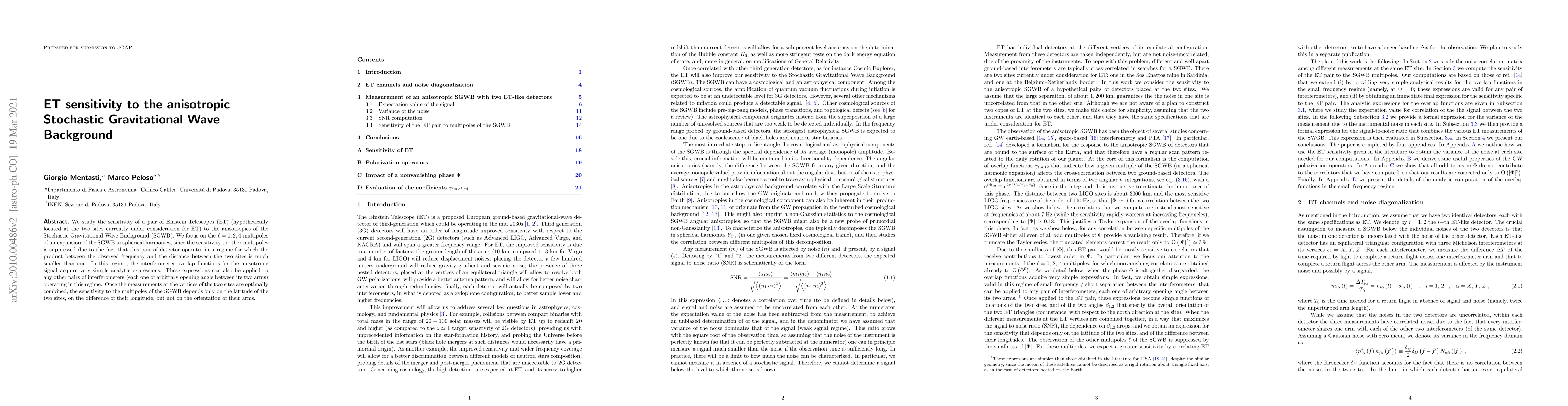 This paper investigates the Einstein Telescope's sensitivity to anisotropies in the Stochastic Gravitational Wave Background, focusing on $\ell = 0, 2, 4$ multipoles. The study finds that the sensitivity depends on the latitude and longitude difference of the detector sites, but not on the arm orientation.