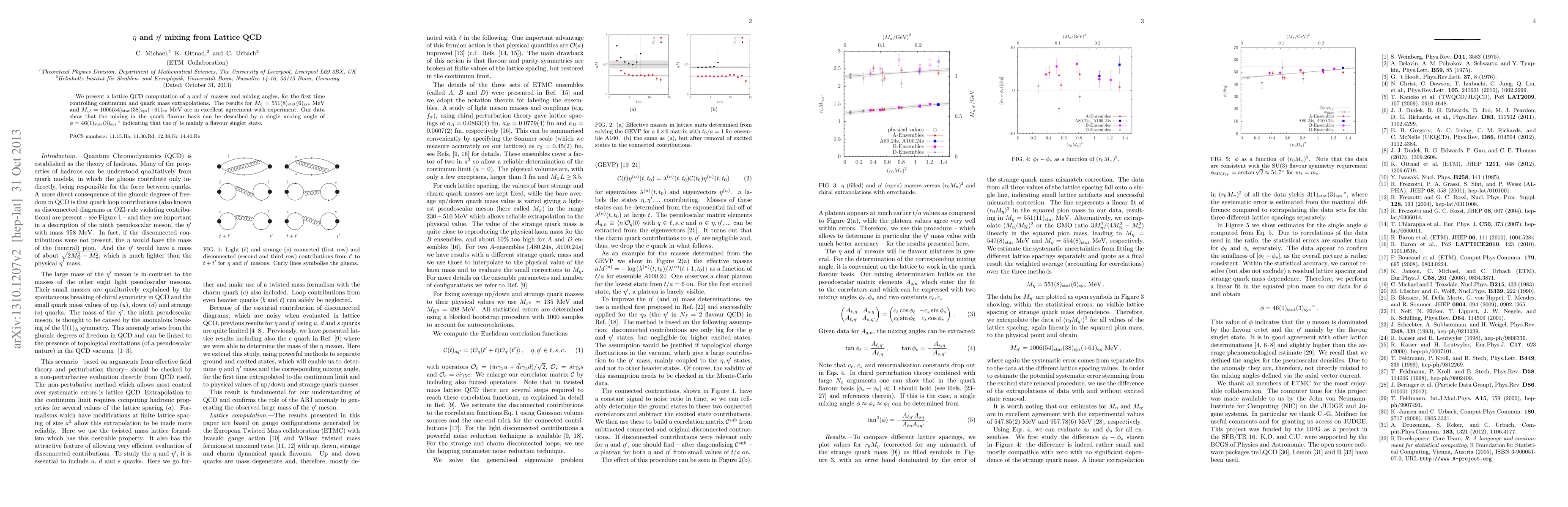 We present a lattice QCD computation of $\eta$ and $\eta^\prime$ masses and mixing angles, for the first time controlling continuum and quark mass extrapolations. The results for the eta mass 551(8)(6) MeV (first error statistical, second systematic) and the eta' mass 1006(54)(38)(+61) MeV (third error from our method) are in excellent agreement with experiment. Our data show that the mixing in the quark flavour basis can be described by a single mixing angle of 46(1)(3) degree indicating that the eta' is mainly a flavour singlet state.