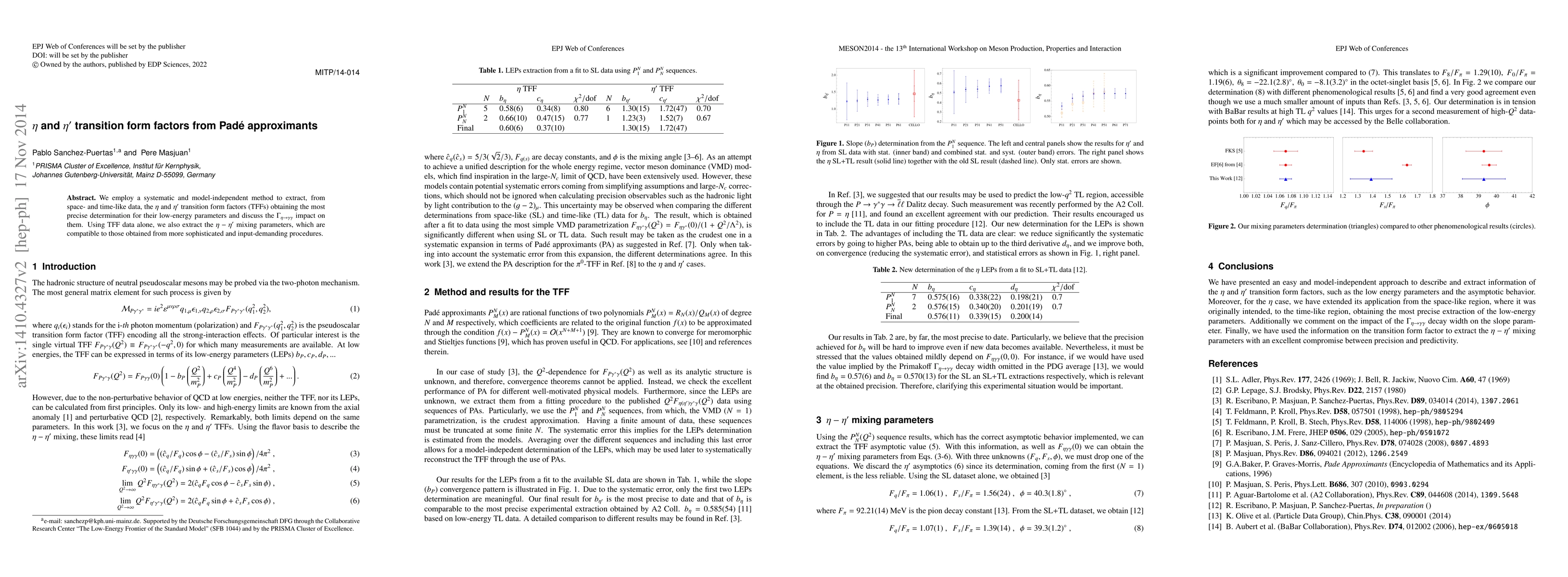 This paper uses Padé approximants to determine the $\eta$ and $\eta'$ transition form factors from both space- and time-like data, achieving precise low-energy parameters. It also discusses the impact of $\Gamma_{\eta\rightarrow\gamma\gamma}$ and extracts $\eta-\eta'$ mixing parameters comparable to more complex methods.