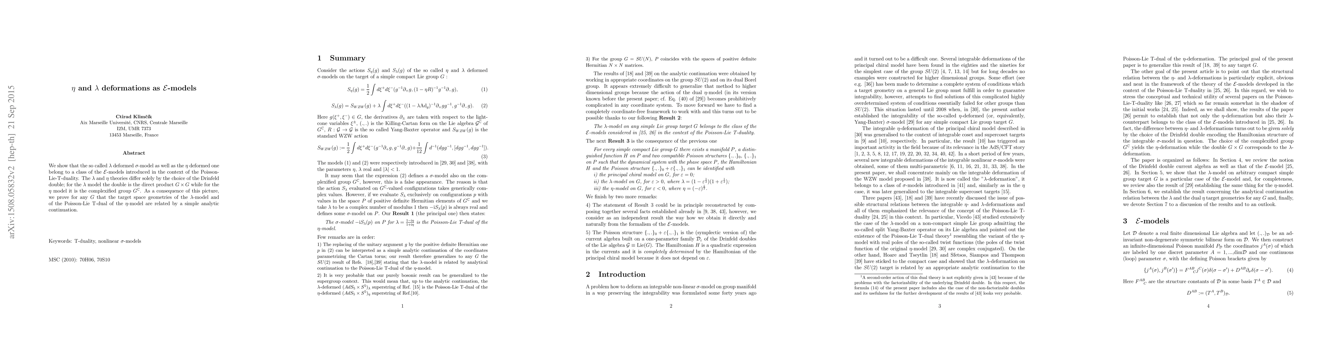We show that the so called $\lambda$ deformed $\sigma$-model as well as the $\eta$ deformed one belong to a class of the ${\cal E}$-models introduced in the context of the Poisson-Lie-T-duality. The $\lambda$ and $\eta$ theories differ solely by the choice of the Drinfeld double; for the $\lambda$ model the double is the direct product $G\times G$ while for the $\eta$ model it is the complexified group $G^{\mathbb{C}}$. As a consequence of this picture, we prove for any $G$ that the target space geometries of the $\lambda$-model and of the Poisson-Lie T-dual of the $\eta$-model are related by a simple analytic continuation.