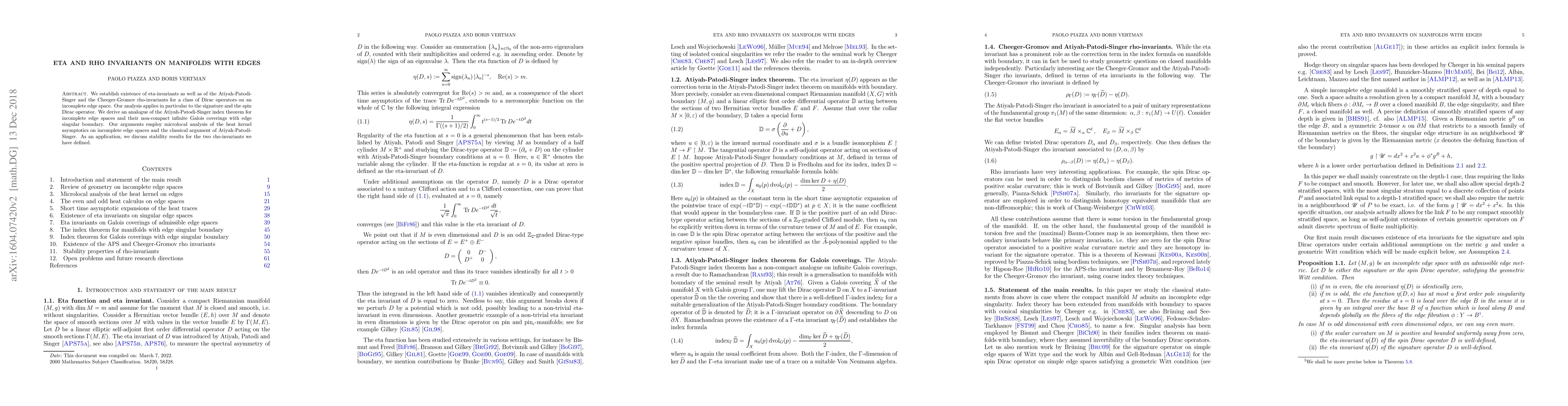 This paper establishes the existence of eta and rho invariants for Dirac operators on incomplete edge spaces, applying to signature, Gauss-Bonnet, and spin Dirac operators. It also derives an analogue of the Atiyah-Patodi-Singer index theorem for these spaces and provides stability results for the defined rho invariants.
